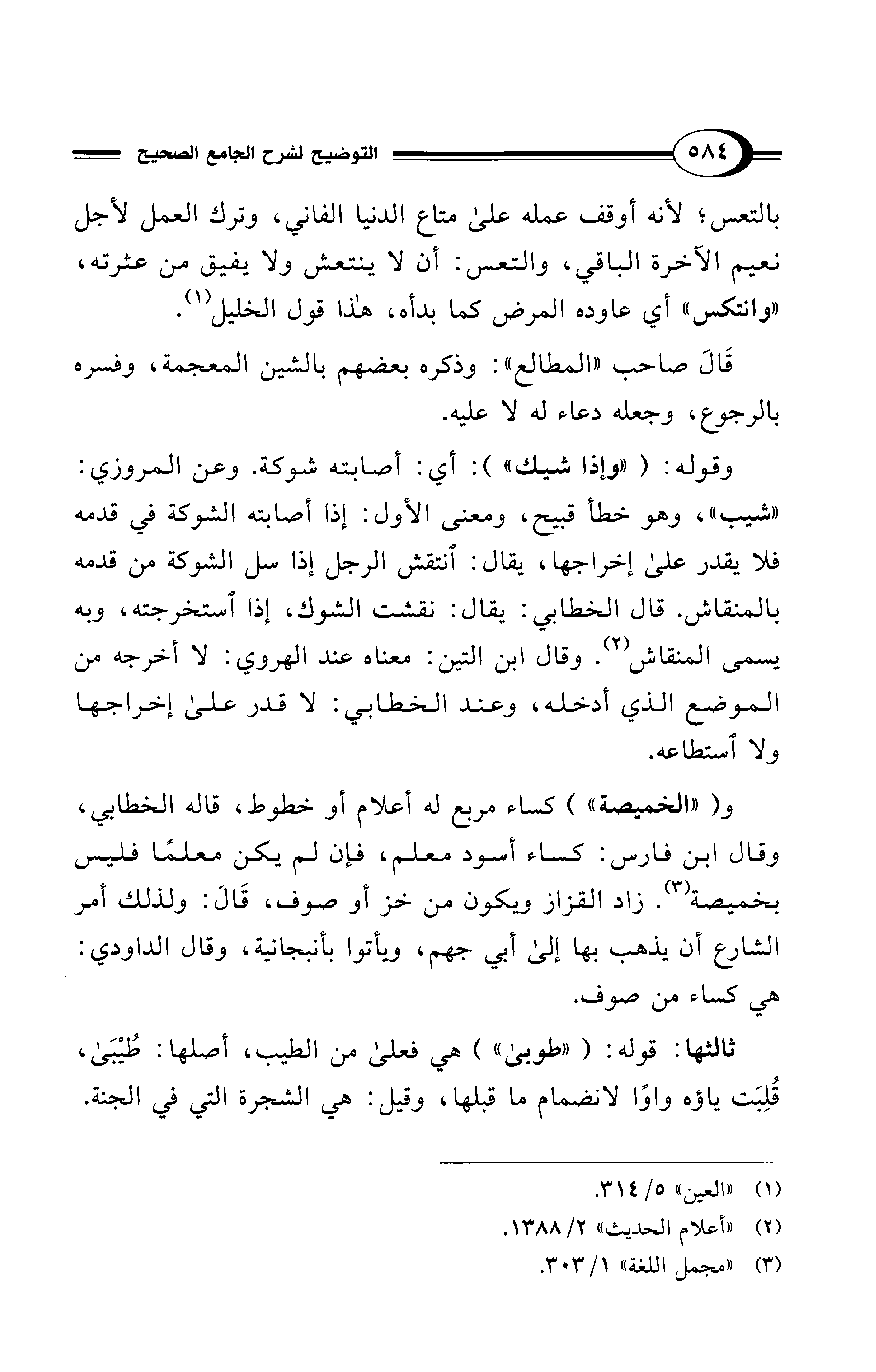 و ("الخميصة") كساء مربع له أعلام أو خطوط، قاله الخطابي، وقال ابن فارس: كساء أسود معلم، فإن لم يكن معلمًا فليس بخميصة (¬3). زاد القزاز ويكون من خز أو صوف، قَالَ: ولذلك أمر الشارع أن يذهب بها إلى أبي جهم، ويأتوا بأنبجانية، وقال الداودي: هي كساء من صوف.