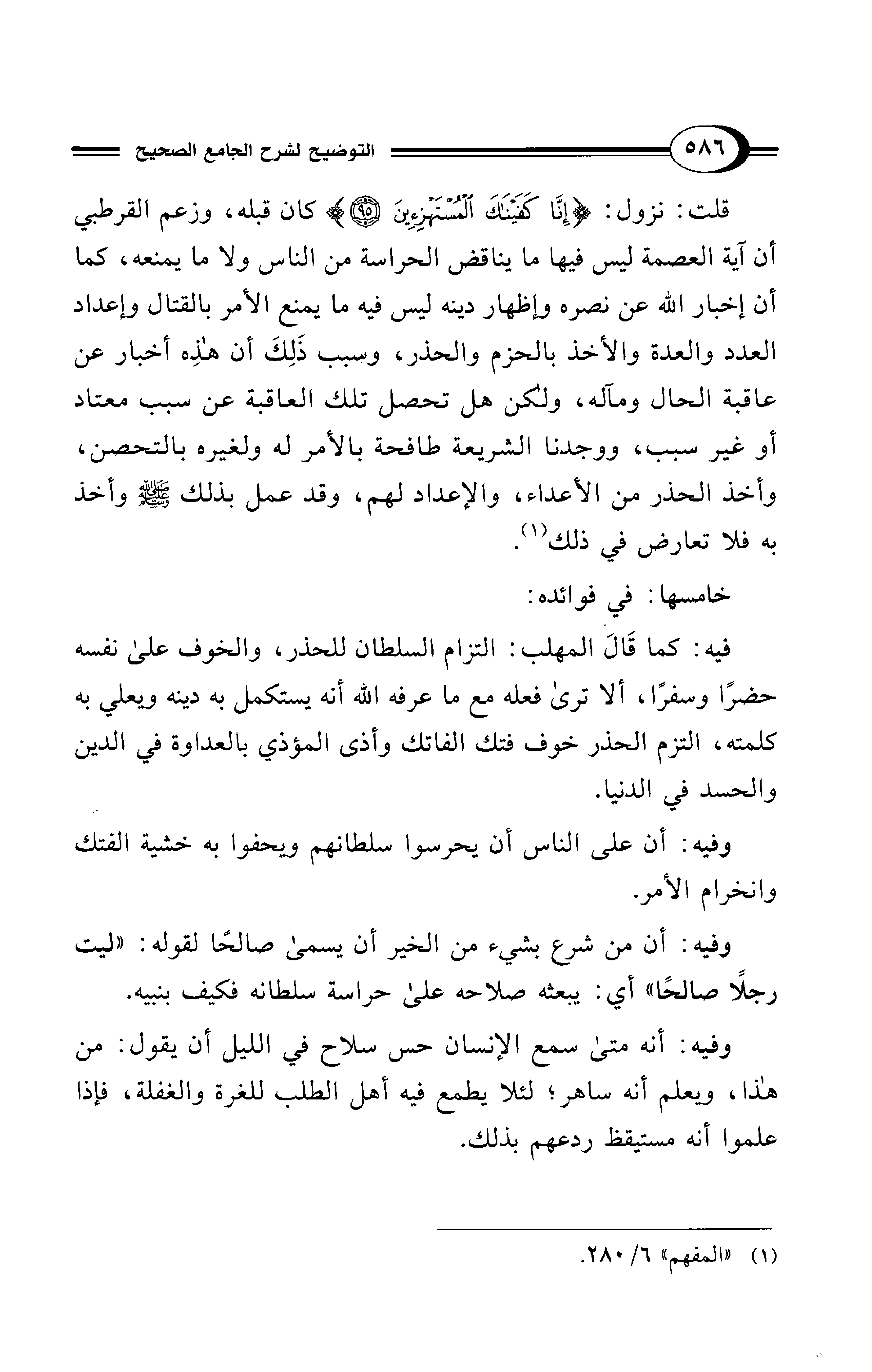 قلت: نزول: {إِنَّا كَفَيْنَاكَ الْمُسْتَهْزِئِينَ (95)} كان قبله، وزعم القرطبي أن آية العصمة ليس فيها ما يناقض الحراسة من الناس ولا ما يمنعه، كما أن إخبار الله عن نصره وإظهار دينه ليس فيه ما يمنع الأمر بالقتال وإعداد العدد والعدة والأخذ بالحزم والحذر، وسبب ذَلِكَ أن هذِه أخبار عن عاقبة الحال ومآله، ولكن هل تحصل تلك العاقبة عن سبب معتاد أو غير سبب، ووجدنا الشريعة طافحة بالأمر له ولغيره بالتحصن، وأخذ الحذر من الأعداء، والإعداد لهم، وقد عمل بذلك - صلى الله عليه وسلم - وأخذ به فلا تعارض في ذلك (¬1).