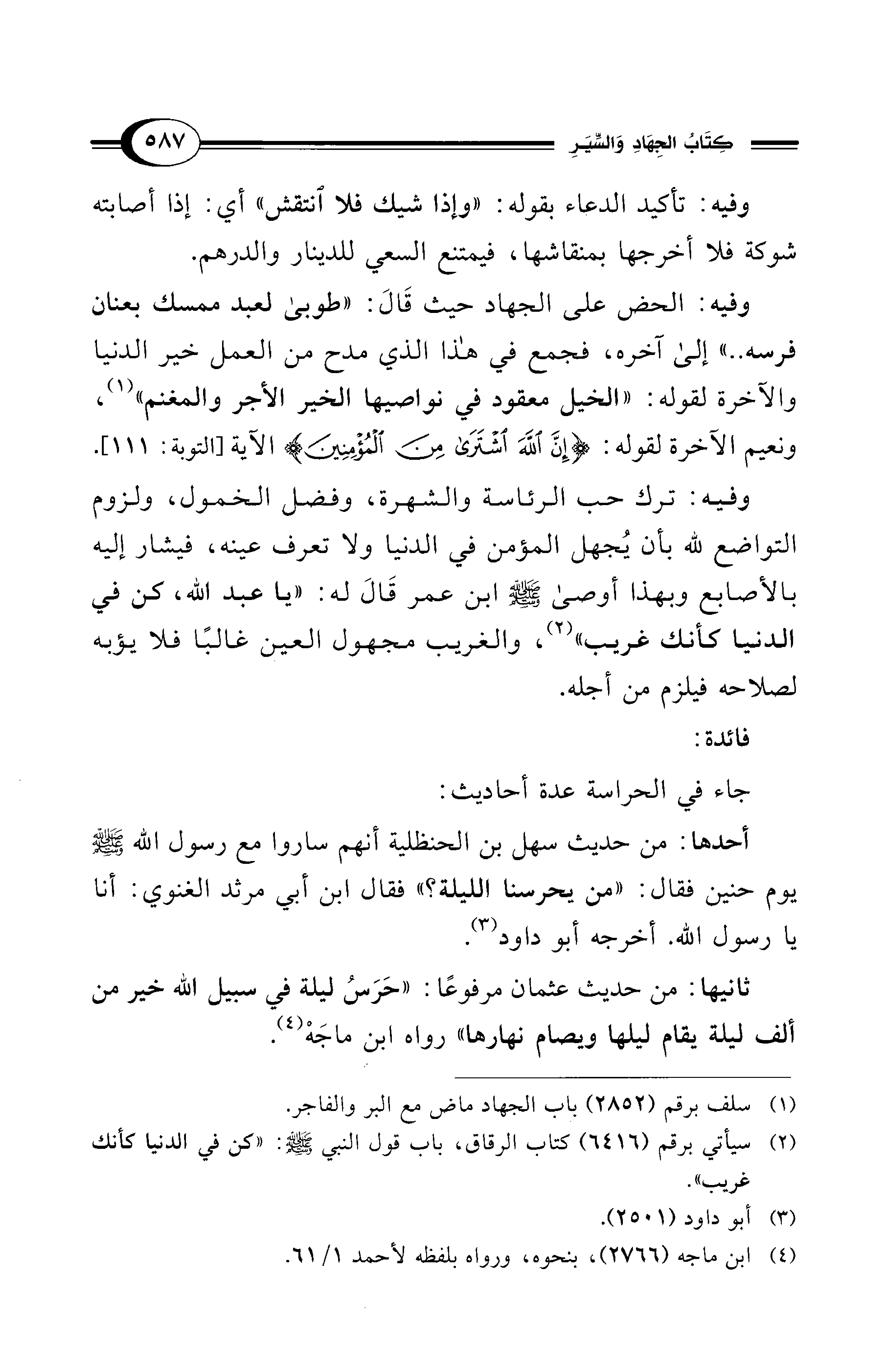 ثانيها: من حديث عثمان مرفوعًا: "حَرَسُ ليلة في سبيل الله خير من ألف ليلة يقام ليلها ويصام نهارها" رواه ابن ماجَهْ (¬4).