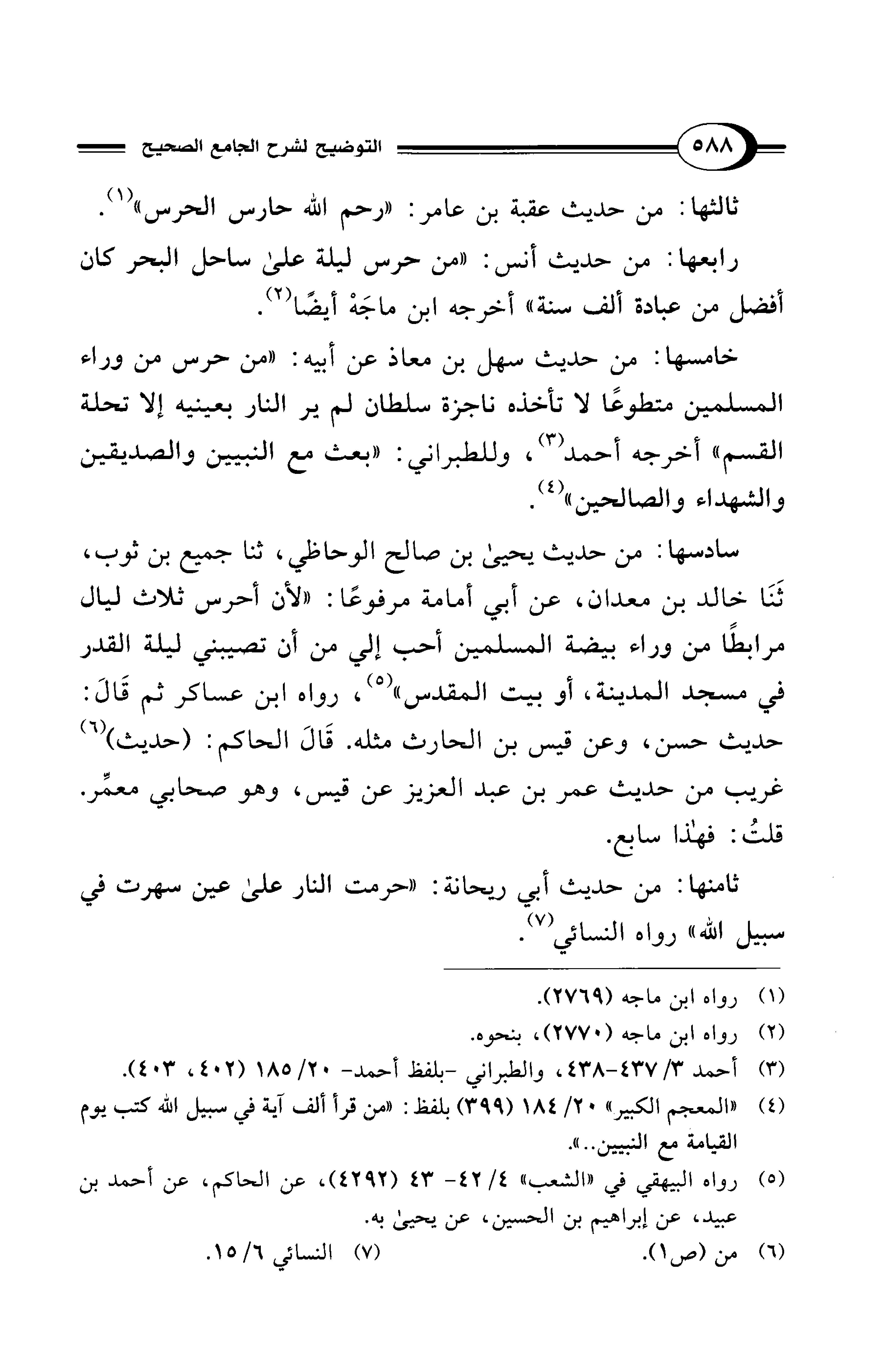 خامسها: من حديث سهل بن معاذ عن أبيه: "من حرس من وراء المسلمين متطوعًا لا تأخذه ناجزة سلطان لم ير النار بعينيه إلا تحلة القسم" أخرجه أحمد (¬3)، وللطبراني: "بعث مع النبيين والصديقين والشهداء والصالحين" (¬4).
