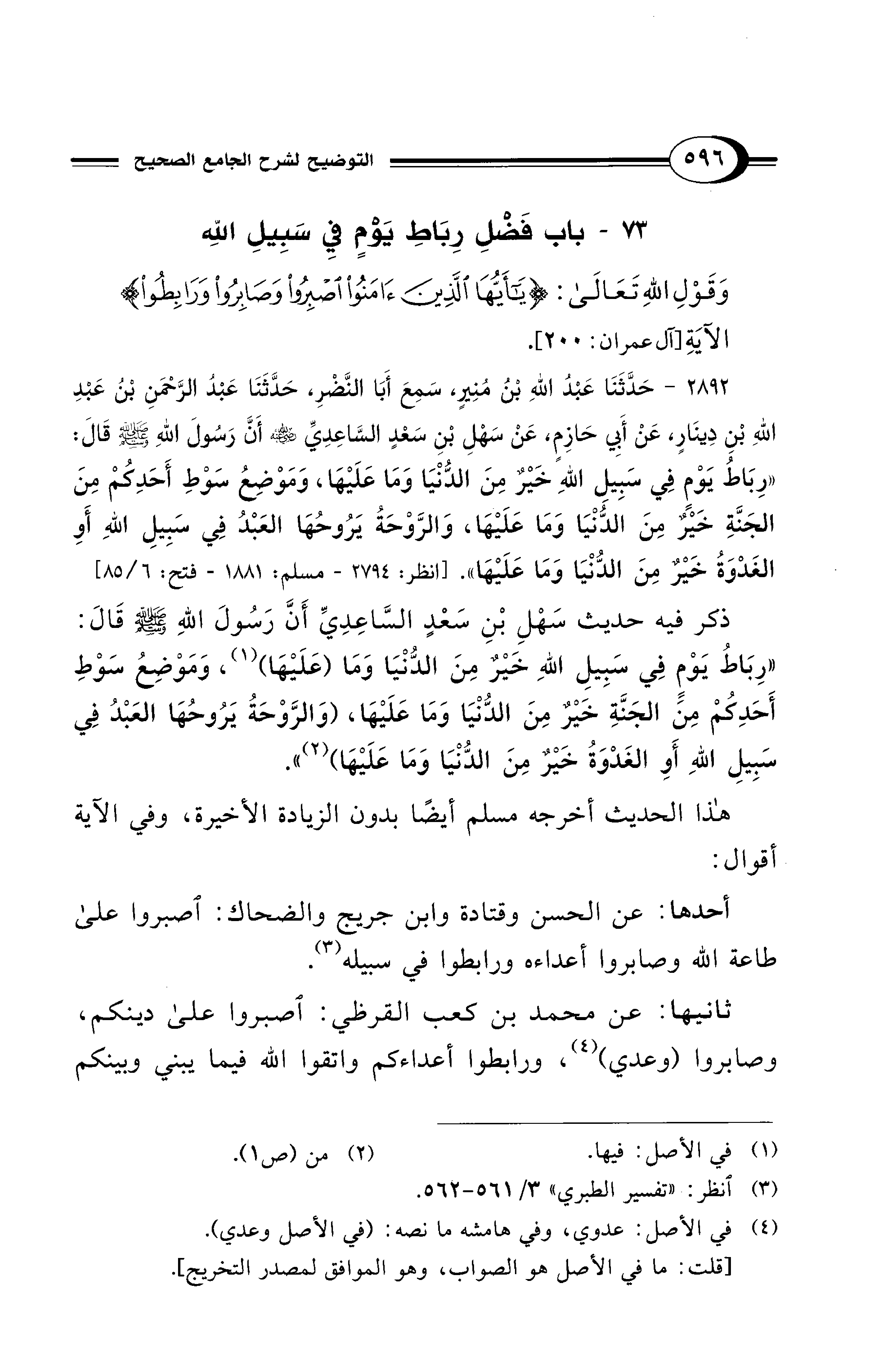 وَقَوْلِ اللهِ تَعَالَى: {يَا أَيُّهَا الَّذِينَ آمَنُوا اصْبِرُوا وَصَابِرُوا وَرَابِطُوا} الآيَةِ [آل عمران: 200].