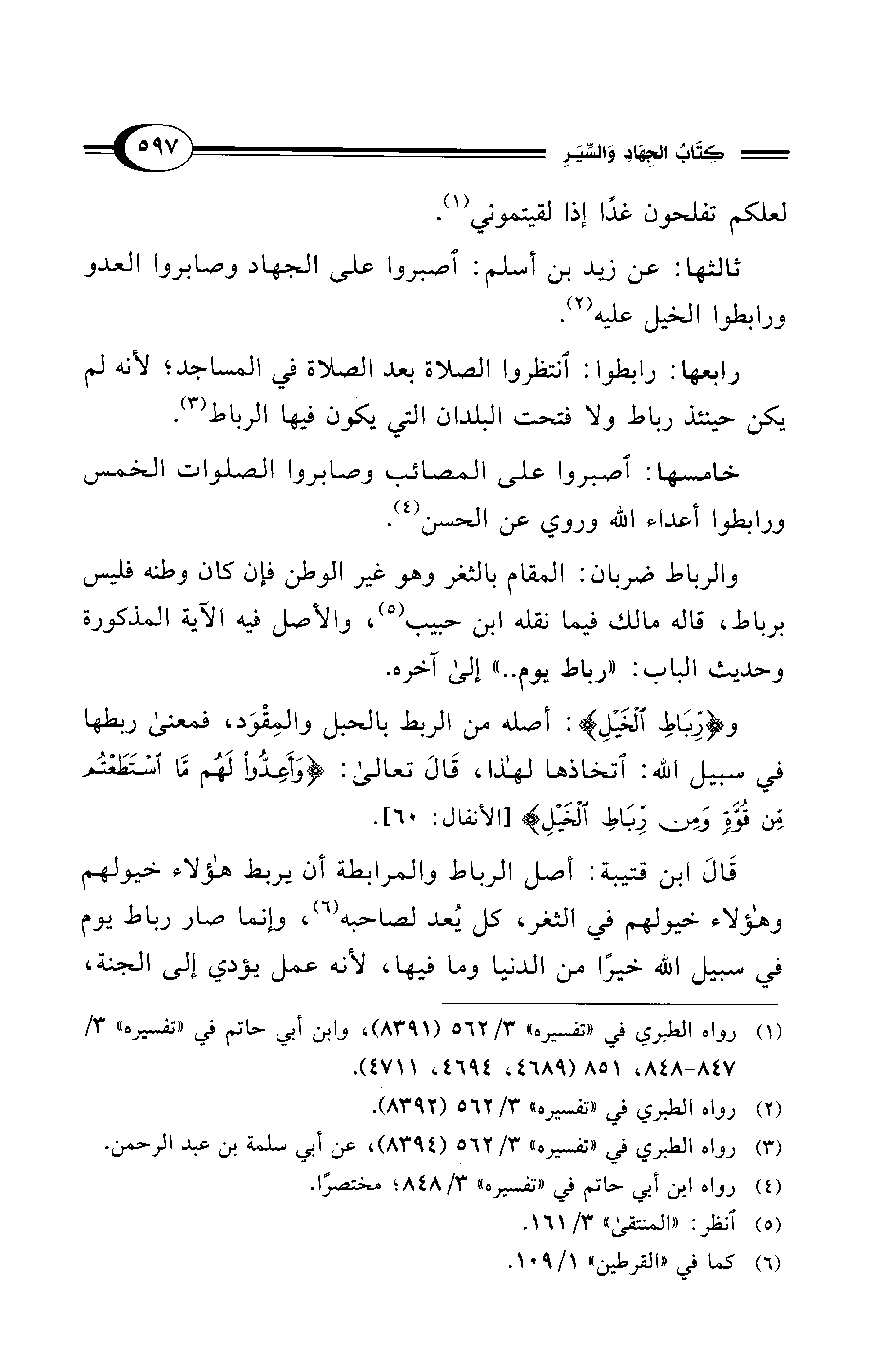 ثالثها: عن زيد بن أسلم: اصبروا على الجهاد وصابروا العدو ورابطوا الخيل عليه (¬2).