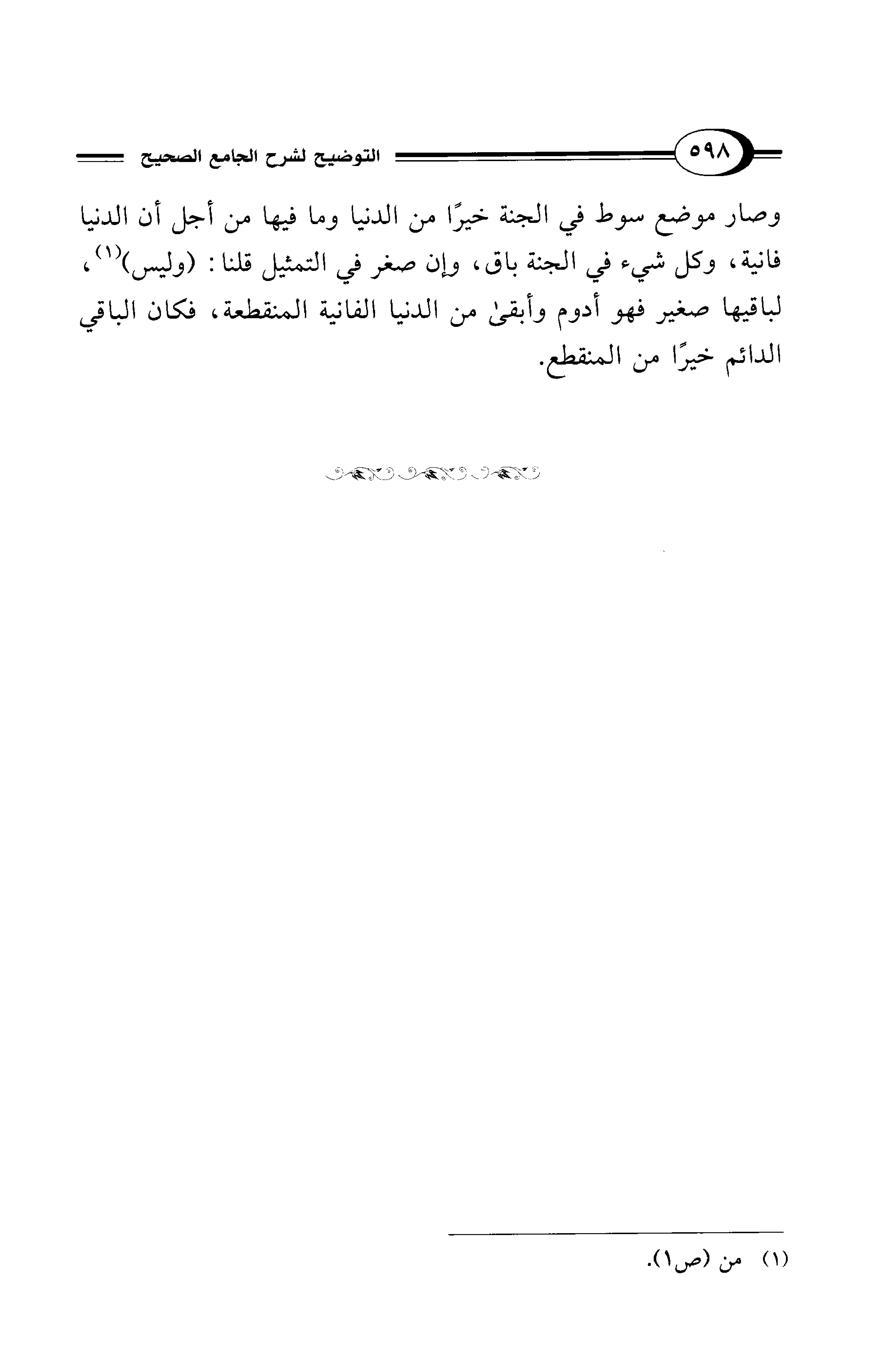 وصار موضع سوط في الجنة خيرًا من الدنيا وما فيها من أجل أن الدنيا فانية، وكل شيء في الجنة باق، وإن صغر في التمثيل قلنا: (وليس) (¬1)، لباقيها صغير فهو أدوم وأبقى من الدنيا الفانية المنقطعة، فكان الباقي الدائم خيرًا من المنقطع.