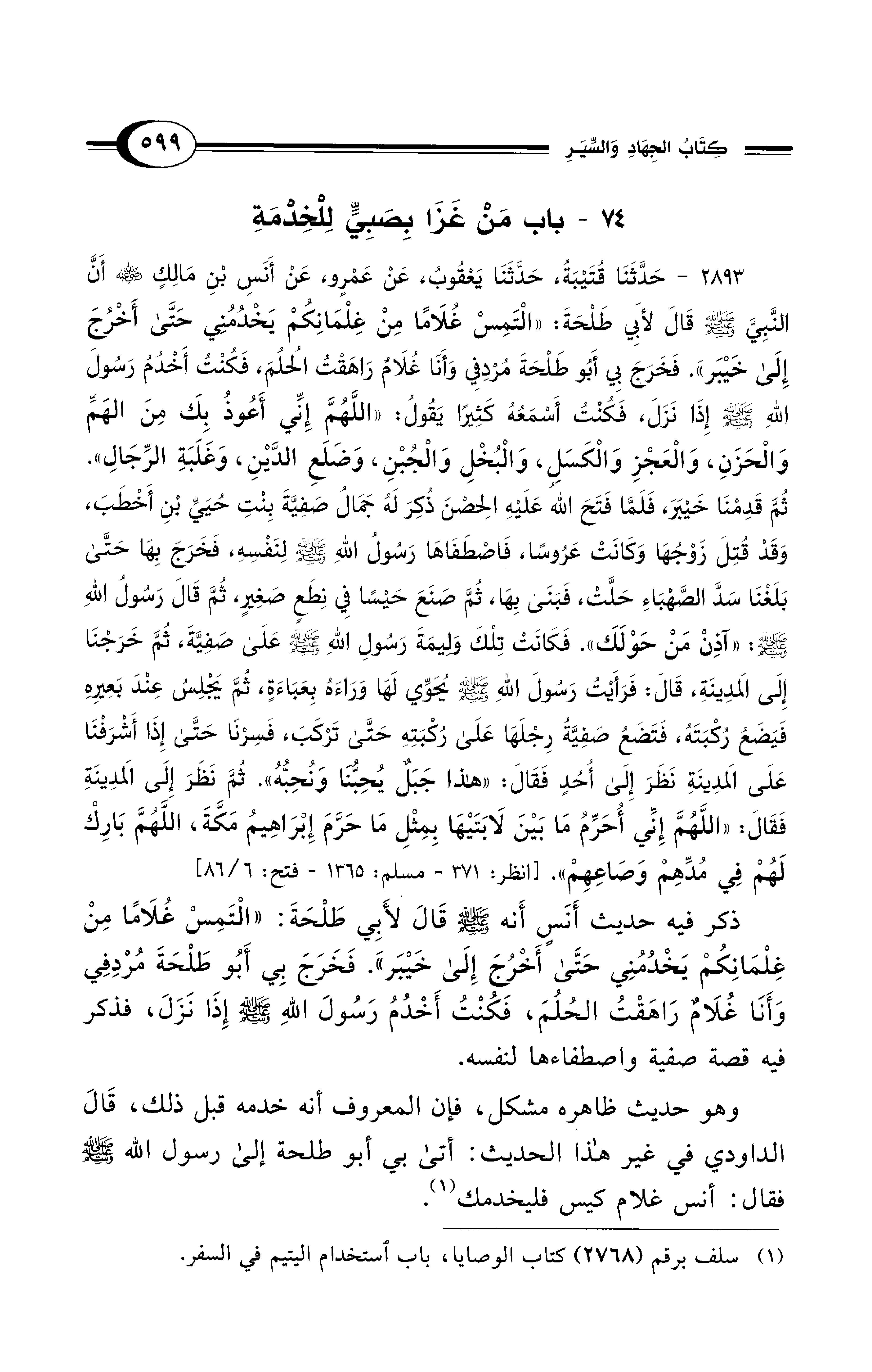 ذكر فيه حديث أَنَسٍ أَنه - صلى الله عليه وسلم - قالَ لأَبِي طَلْحَةَ: "الْتَمِسْ غُلَامًا مِنْ غِلْمَانِكُمْ يَخْدُمُنِي حَتَّى أَخْرُجَ إِلَى خَيْبَرَ". فَخَرَجَ بِي أَبُو طَلْحَةَ مُرْدِفِي وَأَنَا غُلَامٌ رَاهَقْتُ الحُلُمَ، فَكُنْتُ أَخْدُمُ رَسُولَ اللهِ - صلى الله عليه وسلم - إذَا نَزَلَ، فذكر فيه قصة صفية واصطفاءها لنفسه.
