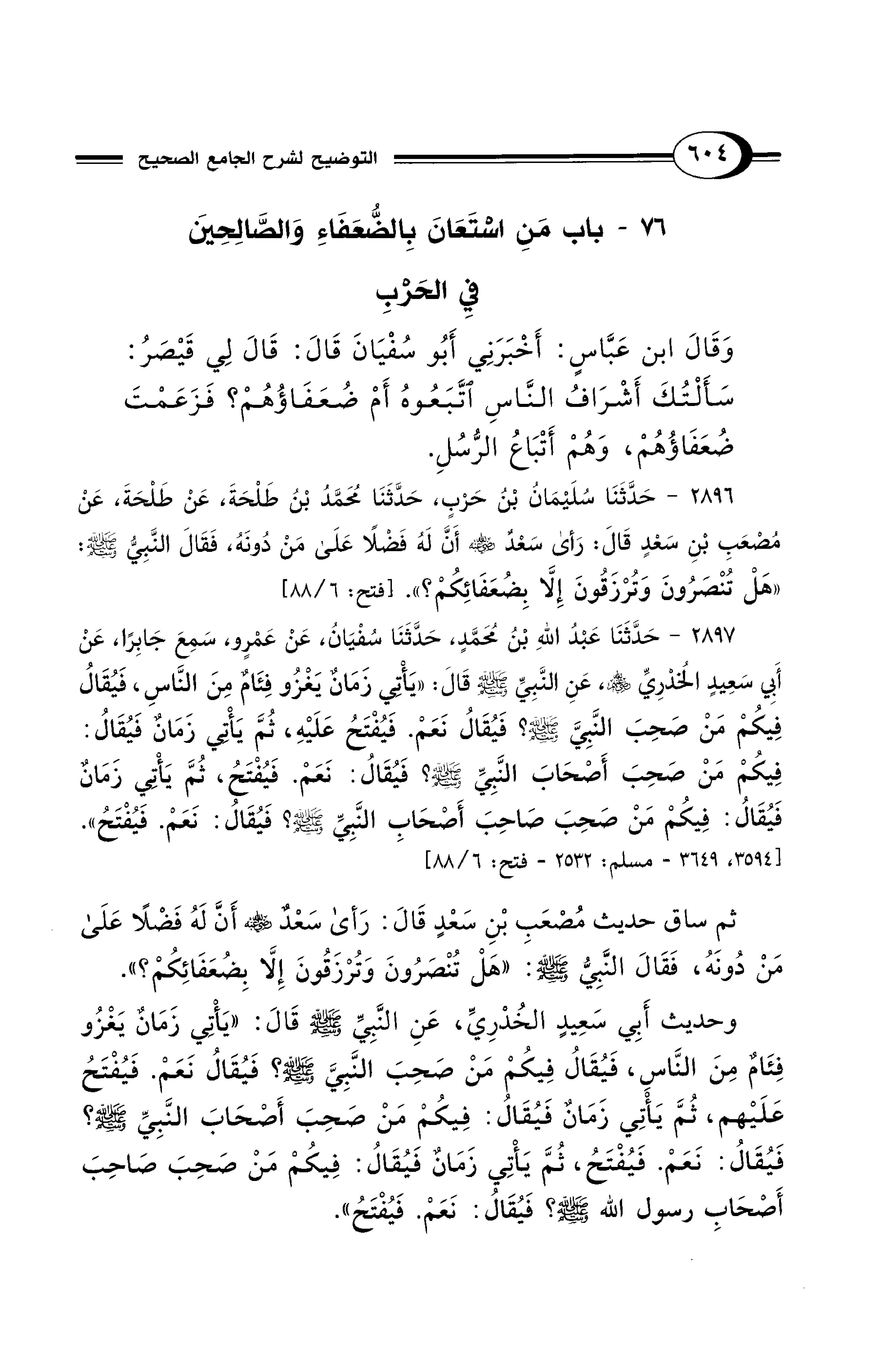 ثمِ ساق حديث مُصعَبِ بْنِ سعْدٍ قَالَ: رَأى سعْدٌ - صلى الله عليه وسلم - أَنَّ لَهُ فَضْلًا عَلَى مَنْ دُونهُ، فَقَالَ النَّبِيُّ - صلى الله عليه وسلم -: "هَلْ تُنْصَرُونَ وَتُرْزَقُونَ إِلَّا بِضُعَفَائِكُمْ؟ ".