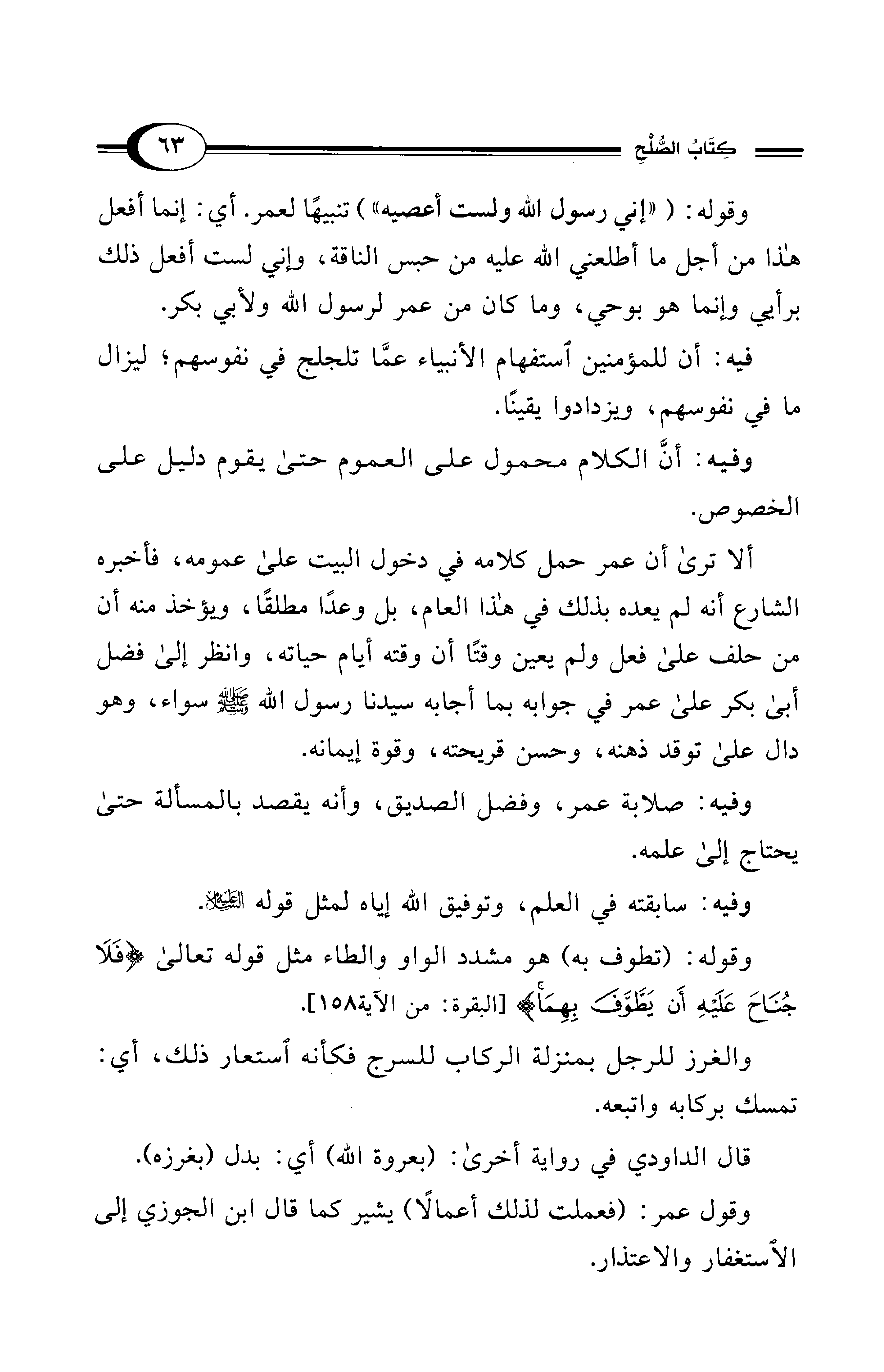 ألا ترى أن عمر حمل كلامه في دخول البيت على عمومه، فأخبره الشارع أنه لم يعده بذلك في هذا العام، بل وعدًا مطلقًا، ويؤخذ منه أن من حلف على فعل ولم يعين وقتًا أن وقته أيام حياته، وانظر إلى فضل أبي بكر على عمر في جوابه بما أجابه سيدنا رسول الله - صلى الله عليه وسلم - سواء، وهو دال على توقد ذهنه، وحسن قريحته، وقوة إيمانه.