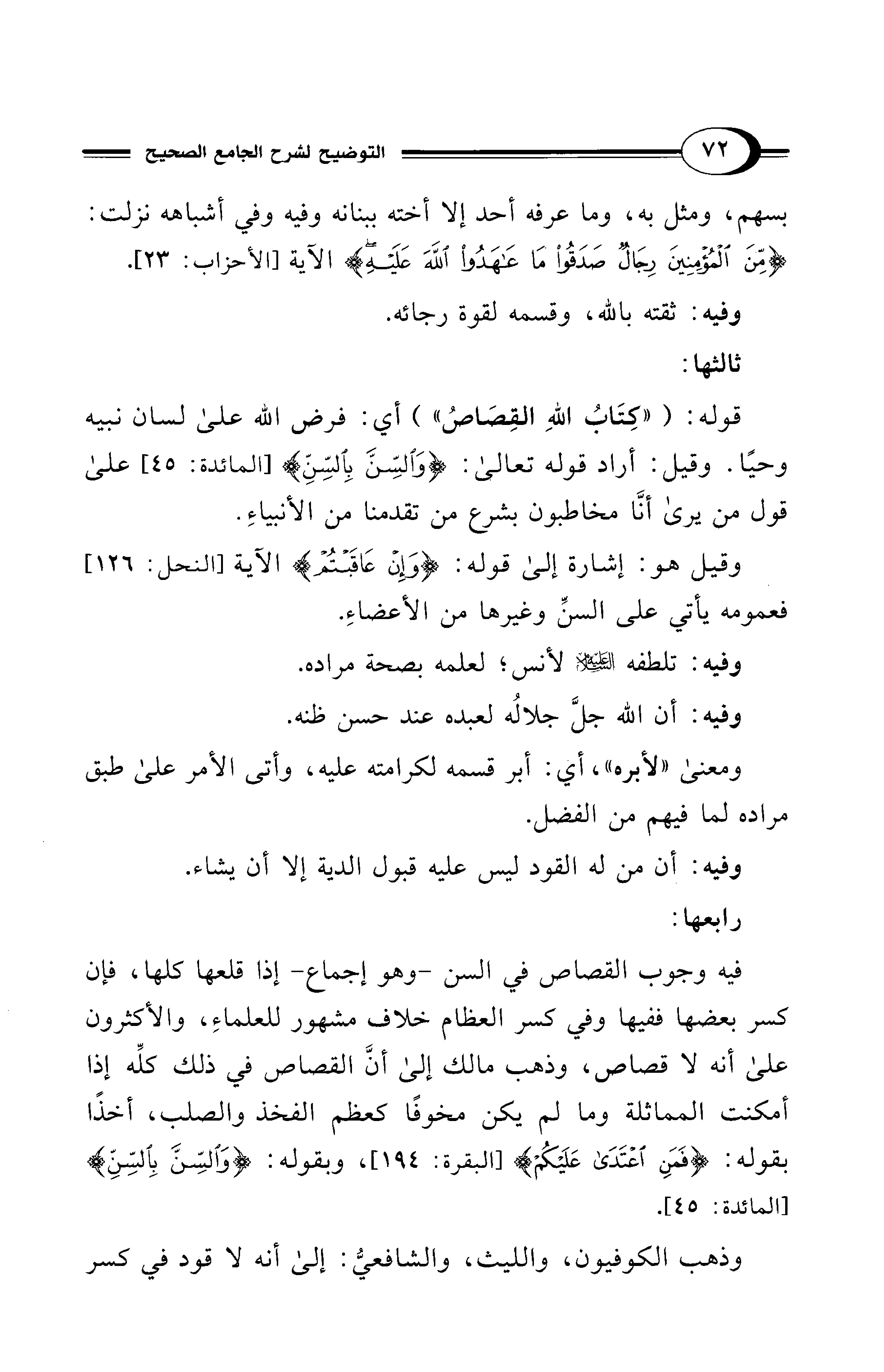 فيه وجوب القصاص في السنن -وهو إجماع- إذا قلعها كلها، فإن كسر بعضها ففيها وفي كسر العظام خلاف مشهور للعلماءِ، والأكثرون على أنه لا قصاص، وذهب مالك إلى أنَّ القصاص في ذلك كلِّه إذا أمكنت المماثلة وما لم يكن مخوفًا كعظم الفخذ والصلب، أخذًا بقوله: {فَمَنِ اعْتَدَى عَلَيْكُمْ} [البقرة: 194]، وبقوله: {وَالسِّنَّ بِالسِّنِّ} [المائدة: 45].