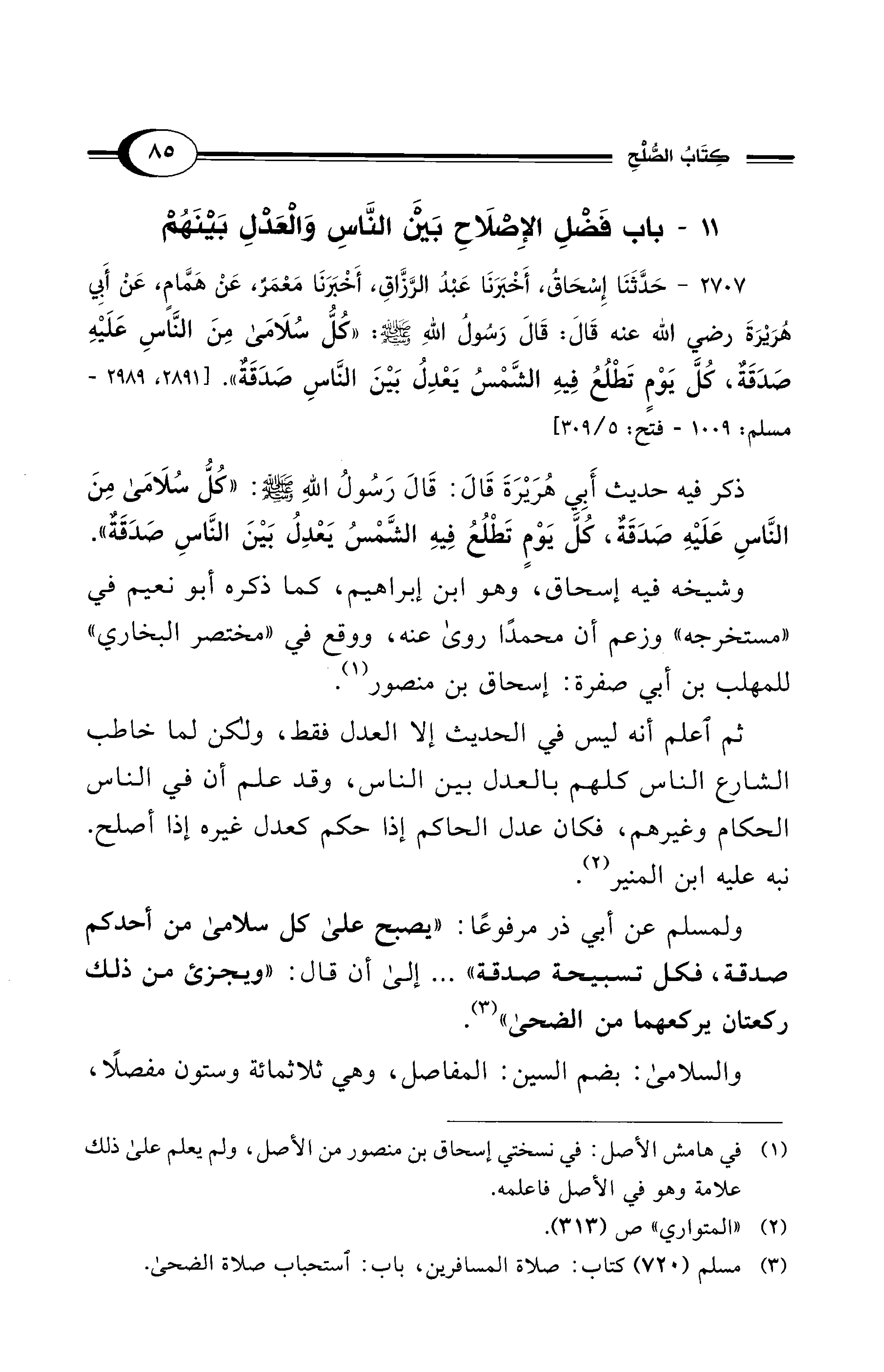 2707 - حَدَّثَنَا إِسْحَاقُ، أَخْبَرَنَا عَبْدُ الرَّزَّاقِ، أَخْبَرَنَا مَعْمَرٌ، عَنْ هَمَّامٍ، عَنْ أَبِي هُرَيْرَةَ رضي الله عنه قَالَ: قَالَ رَسُولُ اللهِ - صلى الله عليه وسلم -: "كُلُّ سُلاَمَى مِنَ النَّاسِ عَلَيْهِ صَدَقَةٌ، كُلَّ يَوْمٍ تَطْلُعُ فِيهِ الشَّمْسُ يَعْدِلُ بَيْنَ النَّاسِ صَدَقَةٌ". [2891، 2989 - مسلم: 1009 - فتح: 5/ 309]
