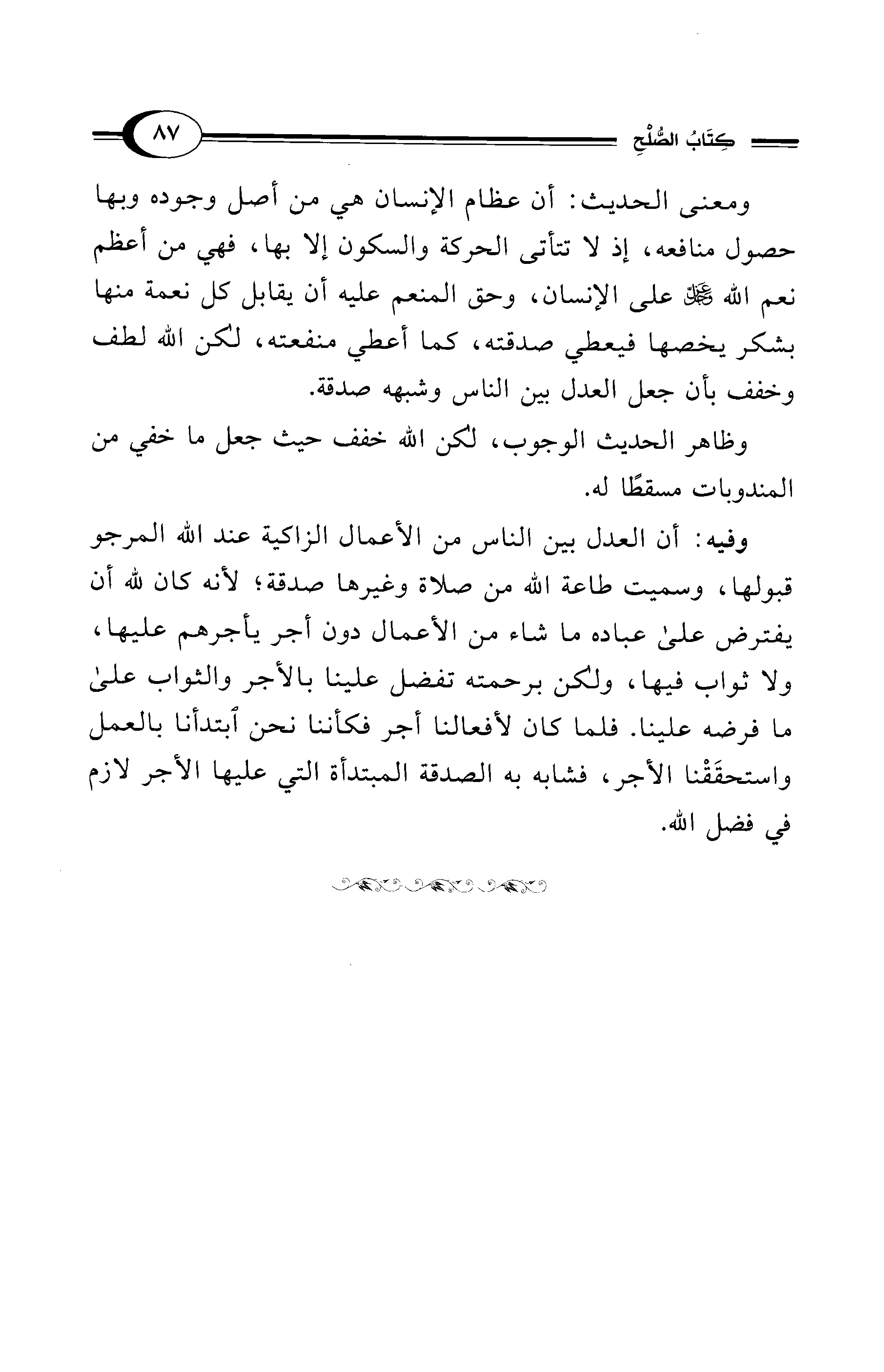 وفيه: أن العدل بين الناس من الأعمال الزاكية عند الله المرجو قبولها، وسميت طاعة الله من صلاة وغيرها صدقة؛ لأنه كان لله أن يفترض على عباده ما شاء من الأعمال دون أجر يأجرهم عليها، ولا ثواب فيها، ولكن برحمته تفضل علينا بالأجر والثواب على ما فرضه علينا. فلما كان لأفعالنا أجر فكأننا نحن ابتدأنا بالعمل واستحقَقْنا الأجر، فشابه به الصدقة المبتدأة التي عليها الأجر لازم في فضل الله.