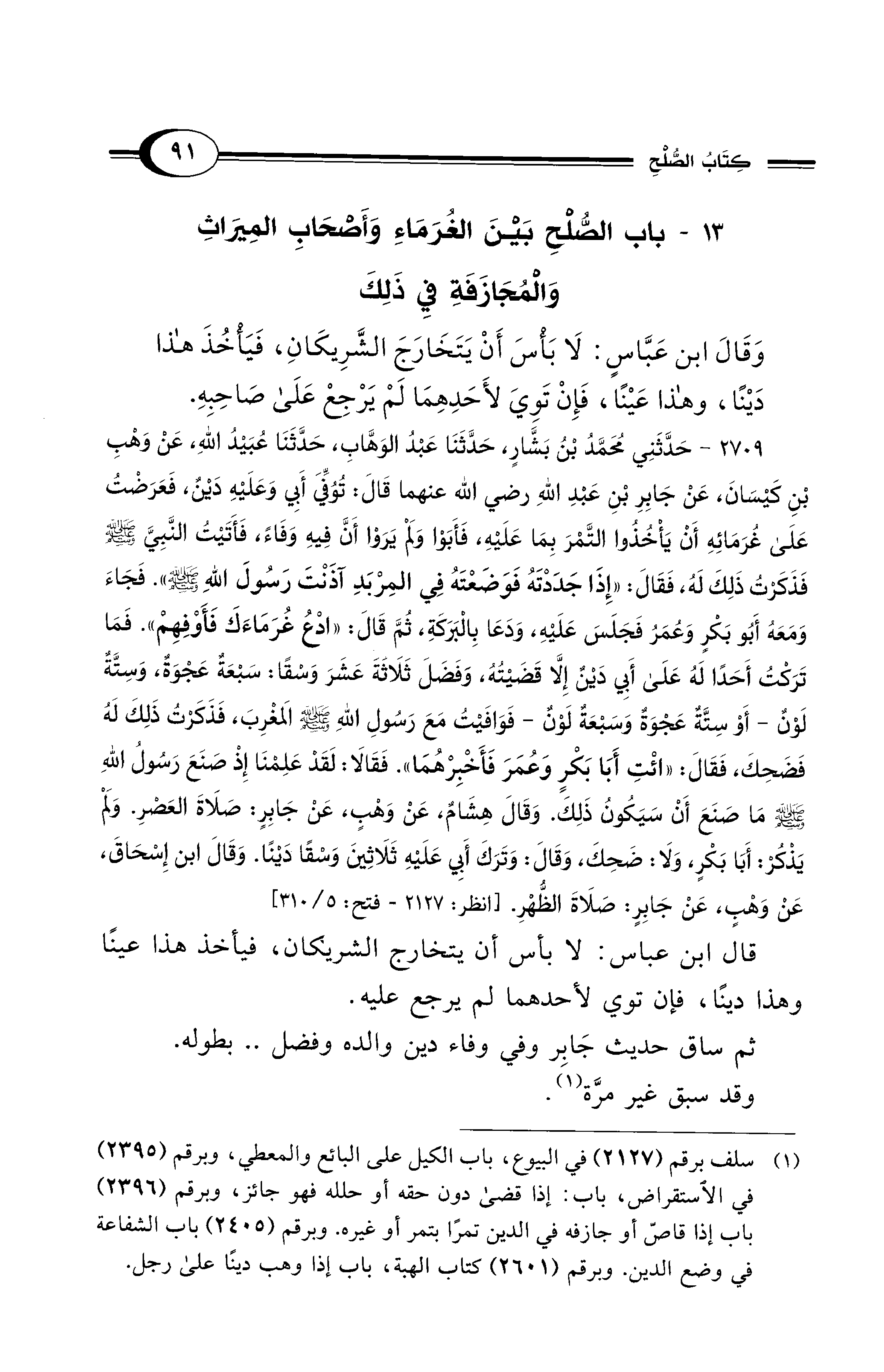 (¬1) سلف برقم (2127) في البيوع، باب الكيل على البائع والمعطي، وبرقم (2395) في الاستقراض، باب: إذا قضى دون حقه أو حلله فهو جائز، وبرقم (2396) باب إذا قاصّ أو جازفه في الدين تمرًا بتمر أو غيره. وبرقم (2405) باب الشفاعة في وضع الدين. وبرقم (2601) كتاب الهبة، باب إذا وهب دينًا على رجل.
