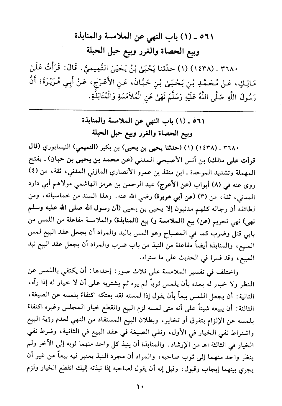 ٣٦٨٠ - (١٤٣٨) (١) حدثنا يَحْيَى بْنُ يَحْيَى التَّمِيمي. قَال: قَرَأتُ عَلَى مَالِكٍ، عَنْ مُحَمدِ بْنِ يَحْيَى بْنِ حَيانَ، عَنِ الأعْرَجِ، عَنْ أَبِي هُرَيرَةَ؛ أنَّ رَسُولَ الله صَلى اللهُ عَلَيهِ وَسَلمَ نَهَى عَنِ الْمُلًامَسَةِ وَالْمُنَابَذَةِ