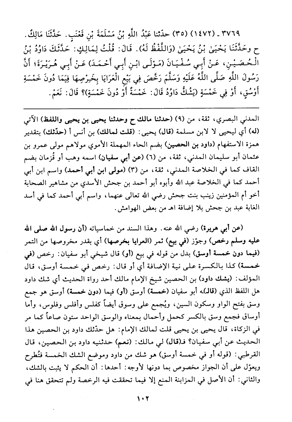 ٣٧٦٩ - (٤٧٢ ١) (٣٥) حدَّثنا عَبْدُ اللهِ بْنُ مَسْلَمَةَ بْنِ قَعْنَبٍ. حَدَّثَنَا مَالِكٌ. ح وحَدَّثَنَا يَحْيَى بْنُ يَحْيَى (وَاللَّفْظُ لَهُ). قَال: قُلْتُ لِمَالِكٍ: حَدَّثَكَ دَاوُدُ بْنُ الْحُصَينِ، عَنْ أبِي سُفْيَانَ (مَوْلَى ابْنِ أَبِي أَحْمَدَ) عَنْ أَبِي هُرَيرَةَ؛ أَن رَسُولَ اللهِ صَلَّى اللهُ عَلَيهِ وَسَلَّمَ رَخَّصَ فِي بَيعِ الْعَرَايَا بِخَرْصِهَا فِيَمَا دُونَ خَمْسَةِ أَوْسُقٍ، أَوْ فِي خَمْسَةٍ (يَشُكُّ دَاوُدُ قَال: خَمْسَةٌ أَوْ دُونَ خَمْسَةٍ)؟ قَال: نَعَمْ