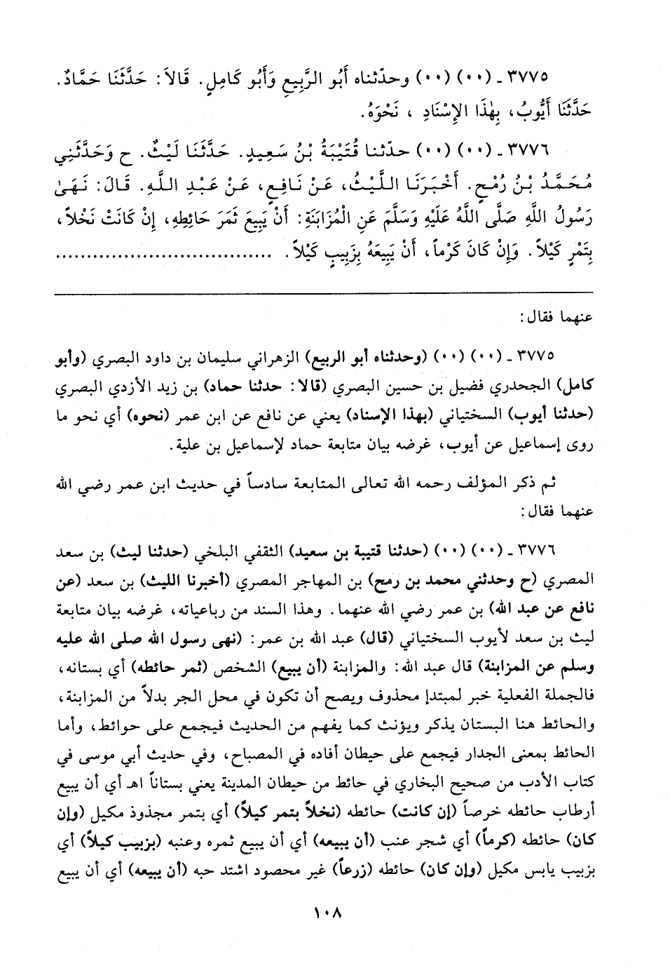 ٣٧٧٦ - (٠٠) (٠٠) (حدثنا قتيبة بن سعيد) الثقفي البلخي (حدثنا ليث) بن سعد المصري (ح وحدثني محمد بن رمح) بن المهاجر المصري (أخبرنا الليث) بن سعد (عن نافع عن عبد الله) بن عمر رضي الله عنهما. وهذا السند من رباعياته، غرضه بيان متابعة ليث بن سعد لأيوب السختياني (قال) عبد الله بن عمر: (نهى رسول الله صلى الله عليه وسلم عن المزابنة) قال عبد الله: والمزابنة (أن يبيع) الشخص (ثمر حائطه) أي بستانه، فالجملة الفعلية خبر لمبتدإ محذوف ويصح أن تكون في محل الجر بدلًا من المزابنة، والحائط هنا البستان يذكر ويؤنث كما يفهم من الحديث فيجمع على حوائط، وأما الحائط بمعنى الجدار فيجمع على حيطان أفاده في المصباح، وفي حديث أبي موسى في كتاب الأدب من صحيح البخاري في حائط من حيطان المدينة يعني بستانًا اهـ أي أن يبيع أرطاب حائطه خرصًا (إن كانت) حائطه (نخلًا بتمر كيلًا) أي بتمر مجذوذ مكيل (وإن كان) حائطه (كرمًا) أي شجر عنب (أن يبيعه) أي أن يبيع ثمره وعنبه (بزبيب كيلًا) أي بزبيب يابس مكيل (وإن كان) حائطه (زرعًا) غير محصود اشتد حبه (أن يبيعه) أي أن يبيع