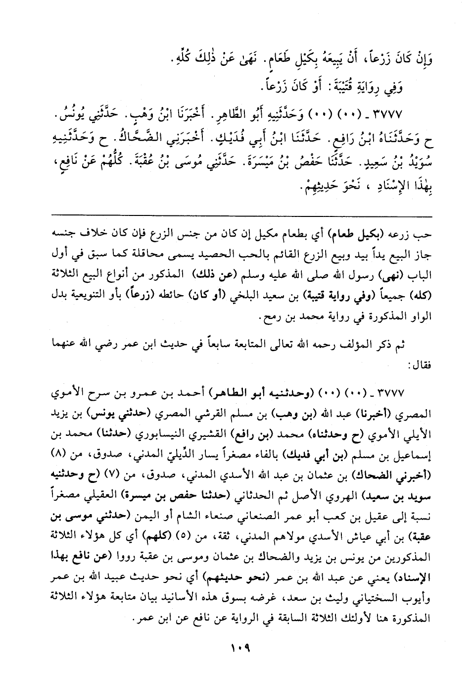 ٣٧٧٧ - (٠٠) (٠٠) (وحدثنيه أبو الطاهر) أحمد بن عمرو بن سرح الأموي المصري (أخبرنا) عبد الله (بن وهب) بن مسلم القرشي المصري (حدثني يونس) بن يزيد الأيلي الأموي (ح وحدثناه) محمد (بن رافع) القشيري النيسابوري (حدثنا) محمد بن إسماعيل بن مسلم (بن أبي فديك) بالفاء مصغرًا يسار الدِّيلي المدني، صدوق، من (٨) (أخبرني الضحاك) بن عثمان بن عبد الله الأسدي المدني، صدوق، من (٧) (ح وحدثنيه سويد بن سعيد) الهروي الأصل ثم الحدثاني (حدثنا حفص بن ميسرة) العقيلي مصغرا نسبة إلى عقيل بن كعب أبو عمر الصنعاني صنعاء الشام أو اليمن (حدثني موسى بن عقبة) بن أبي عياش الأسدي مولاهم المدني، ثقة، من (٥) (كلهم) أي كل هؤلاء الثلاثة المذكورين من يونس بن يزيد والضحاك بن عثمان وموسى بن عقبة رووا (عن نافع بهذا الإسناد) يعني عن عبد الله بن عمر (نحو حديثهم) أي نحو حديث عبيد الله بن عمر وأيوب السختياني وليث بن سعد، غرضه بسوق هذه الأسانيد بيان متابعة هؤلاء الثلاثة المذكورة هنا لأولئك الثلاثة السابقة في الرواية عن نافع عن ابن عمر.