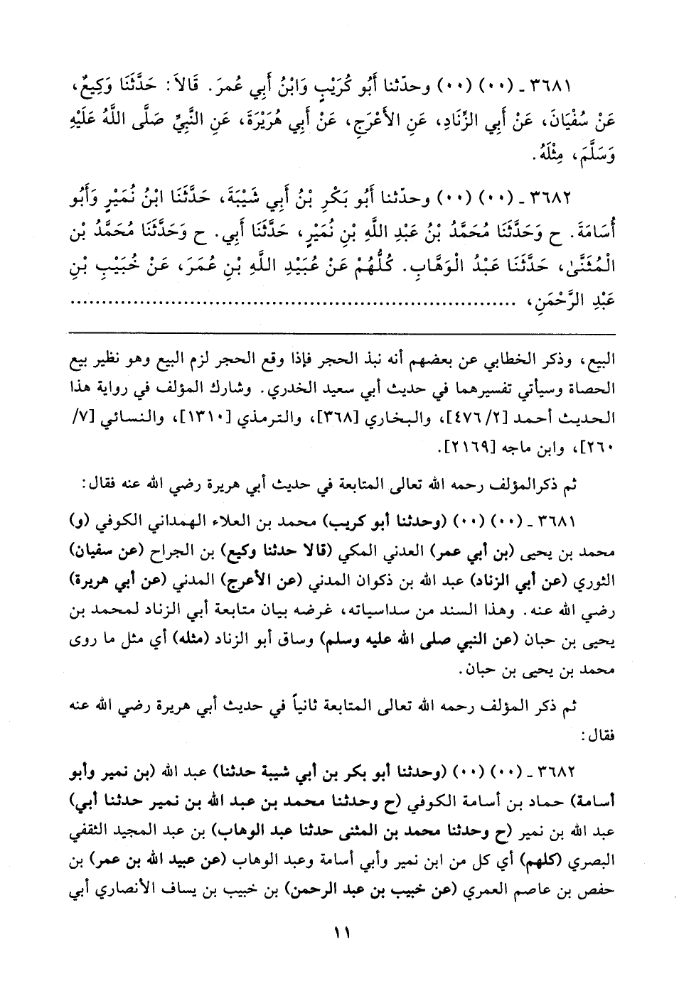 ٣٦٨١ - (٠٠) (٠٠) وحدثنا أبو كريب) محمد بن العلاء الهمداني الكوفي (و) محمد بن يحيى (بن أبي عمر) العدني المكي (قالا حدثنا وكيع) بن الجراح (عن سفيان) الثوري (عن أبي الزناد) عبد الله بن ذكوان المدني (عن الأعرج) المدني (عن أبي هريرة) رضي الله عنه. وهذا السند من سداسياته، غرضه بيان متابعة أبي الزناد لمحمد بن يحيى بن حبان (عن النبي صلى الله عليه وسلم) وساق أبو الزناد (مثله) أي مثل ما روى محمد بن يحيى بن حبان.