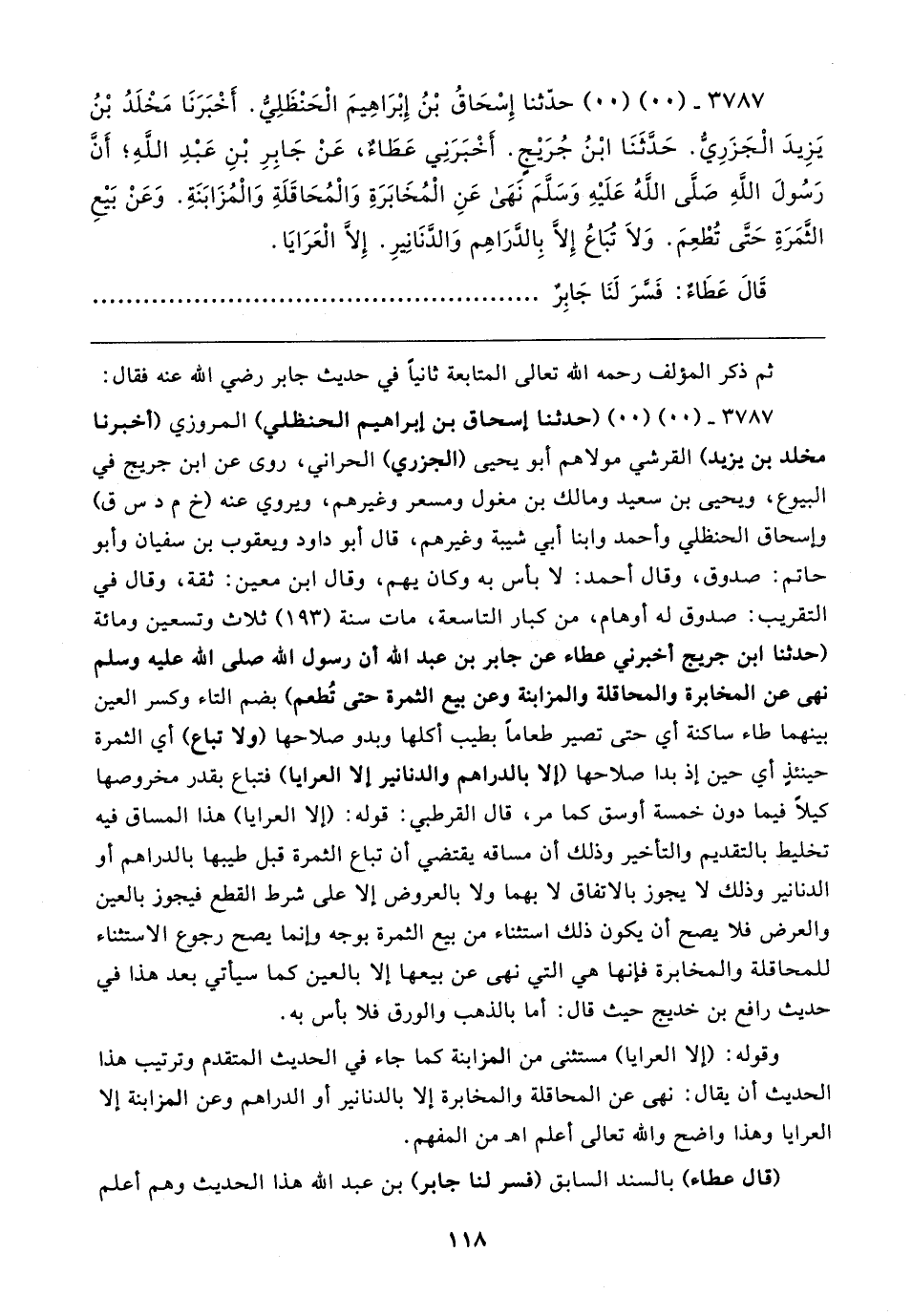 ٣٧٨٧ - (٠٠) (٠٠) (حدثنا إسحاق بن إبراهيم الحنظلي) المروزي (أخبرنا مخلد بن يزيد) القرشي مولاهم أبو يحيى (الجزري) الحراني، روى عن ابن جريج في البيوع، ويحيى بن سعيد ومالك بن مغول ومسعر وغيرهم، ويروي عنه (خ م دس ق) وإسحاق الحنظلي وأحمد وابنا أبي شيبة وغيرهم، قال أبو داود ويعقوب بن سفيان وأبو حاتم: صدوق، وقال أحمد: لا باس به وكان يهم، وقال ابن معين: ثقة، وقال في التقريب: صدوق له أوهام، من كبار التاسعة، مات سنة (١٩٣) ثلاث وتسعين ومائة (حدثنا ابن جريج أخبرني عطاء عن جابر بن عبد الله أن رسول الله صلى الله عليه وسلم نهى عن المخابرة والمحاقلة والمزابنة وعن بيع الثمرة حتى تُطعم) بضم التاء وكسر العين بينهما طاء ساكنة أي حتى تصير طعامًا بطيب أكلها وبدو صلاحها (ولا تباع) أي الثمرة حينئذٍ أي حين إذ بدا صلاحها (إلا بالدراهم والدنانير إلا العرايا) فتباع بقدر مخروصها كيلًا فيما دون خمسة أوسق كما مر، قال القرطبي: قوله: (إلا العرايا) هذا المساق فيه تخليط بالتقديم والتأخير وذلك أن مساقه يقتضي أن تباع الثمرة قبل طيبها بالدراهم أو الدنانير وذلك لا يجوز بالاتفاق لا بهما ولا بالعروض إلا على شرط القطع فيجوز بالعين والعرض فلا يصح أن يكون ذلك استثناء من بيع الثمرة بوجه وإنما يصح رجوع الاستثناء للمحاقلة والمخابرة فإنها هي التي نهى عن بيعها إلا بالعين كما سيأتي بعد هذا في حديث رافع بن خديج حيث قال: أما بالذهب والورق فلا بأس به.