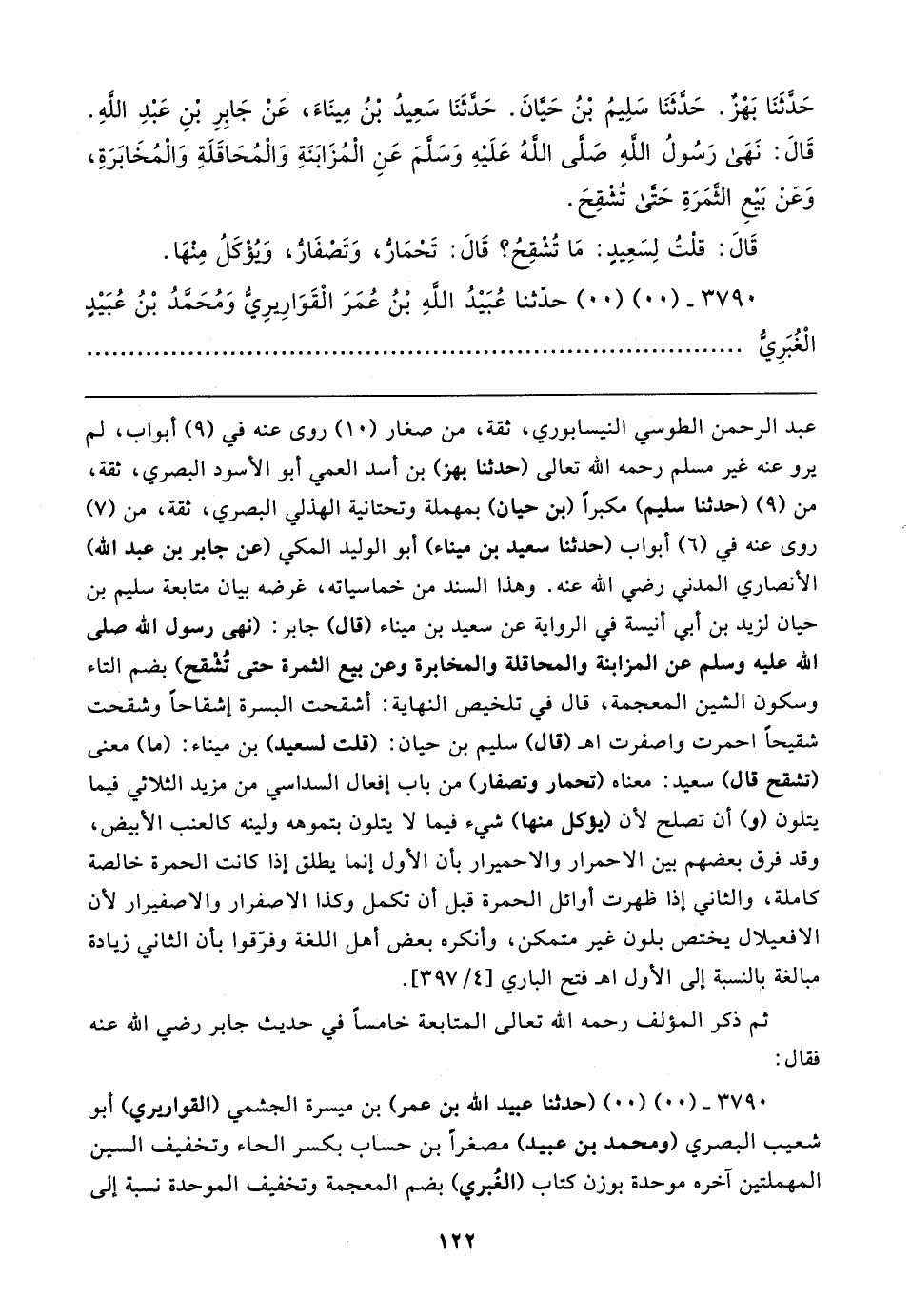 عبد الرحمن الطوسي النيسابوري، ثقة، من صغار (١٠) روى عنه في (٩) أبواب، لم يرو عنه غير مسلم رحمه الله تعالى (حدثنا بهز) بن أسد العمي أبو الأسود البصري، ثقة، من (٩) (حدثنا سليم) مكبرًا (بن حيان) بمهملة وتحتانية الهذلي البصري، ثقة، من (٧) روى عنه في (٦) أبواب (حدثنا سعيد بن ميناء) أبو الوليد المكي (عن جابر بن عبد الله) الأنصاري المدني رضي الله عنه. وهذا السند من خماسياته، غرضه بيان متابعة سليم بن حيان لزيد بن أبي أنيسة في الرواية عن سعيد بن ميناء (قال) جابر: (نهى رسول الله صلى الله عليه وسلم عن المزابنة والمحاقلة والمخابرة وعن بيع الثمرة حتى تُشْقح) بضم التاء وسكون الشين المعجمة، قال في تلخيص النهاية: أشقحت البسرة إشقاحًا وشقحت شقيحًا احمرت واصفرت اهـ (قال) سليم بن حيان: (قلت لسعيد) بن ميناء: (ما) معنى (تشقح قال) سعيد: معناه (تحمار وتصفار) من باب إفعال السداسي من مزيد الثلاثي فيما يتلون (و) أن تصلح لأن (يؤكل منها) شيء فيما لا يتلون بتموهه ولينه كالعنب الأبيض، وقد فرق بعضهم بين الاحمرار والاحميرار بأن الأول إنما يطلق إذا كانت الحمرة خالصة كاملة، والثاني إذا ظهرت أوائل الحمرة قبل أن تكمل وكذا الاصفرار والاصفيرار لأن الافعيلال يختص بلون غير متمكن، وأنكره بعض أهل اللغة وفرّقوا بأن الثاني زيادة مبالغة بالنسبة إلى الأول اهـ فتح الباري [٤/ ٣٩٧].
