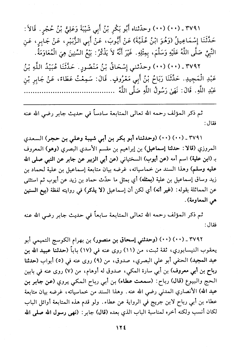 ٣٧٩١ - (٠٠) (٠٠) (وحدثناه أبو بكر بن أبي شيبة وعلي بن حجر) السعدي المروزي (قالا: حدثنا إسماعيل) بن إبراهيم بن مقسم الأسدي البصري (وهو) المعروف بـ (ابن علية) اسم أمه (عن أيوب) السختياني (عن أبي الزبير عن جابر عن النبي صلى الله عليه وسلم) وهذا السند من خماسياته، غرضه بيان متابعة إسماعيل بن علية لحماد بن زيد وساق إسماعيل بن علية (بمثله) أي بمثل ما حدث حماد بن زيد عن أيوب ثم استثنى عن المماثلة بقوله: (غير أنه) أي لكن أن إسماعيل (لا يذكر) في روايته لفظة (بيع السنين هي المعاومة).