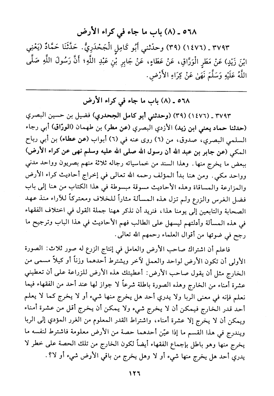 ٣٧٩٣ - (٤٧٦ ١) (٣٩) (وحدثني أبو كامل الجحدري) فضيل بن حسين البصري (حدثنا حماد يعني ابن زيد) الأزدي البصري (عن مطر) بن طهمان (الورّاق) أبي رجاء السلمي البصري، صدوق، من (٦) روى عنه في (٦) أبواب (عن عطاء) بن أبي رباح المكي (عن جابر بن عبد الله أن رسول الله صلى الله عليه وسأنهى عن كراء الأرض) ببعض ما يخرج منها. وهذا السند من خماسياته رجاله ثلاثة منهم بصريون وواحد مدني وواحد مكي. ومن هنا بدأ المؤلف رحمه الله تعالى في إخراج أحاديث كراء الأرض والمزارعة والمساقاة وهذه الأحاديث مسوقة مبسوطة في هذا الكتاب من هنا إلى باب فضل الغرس والزرع ولم تزل هذه المسألة مثارًا للخلاف ومعتركًا للآراء منذ عهد الصحابة والتابعين إلى يومنا هذا، فنريد أن نذكر ها هنا جملة القول في اختلاف الفقهاء في هذه المسألة وأدلتهم ليسهل على الطالب فهم الأحاديث في هذا الباب وترجيح ما رجح في ضوئها من أقوال العلماء رحمهم الله تعالى.