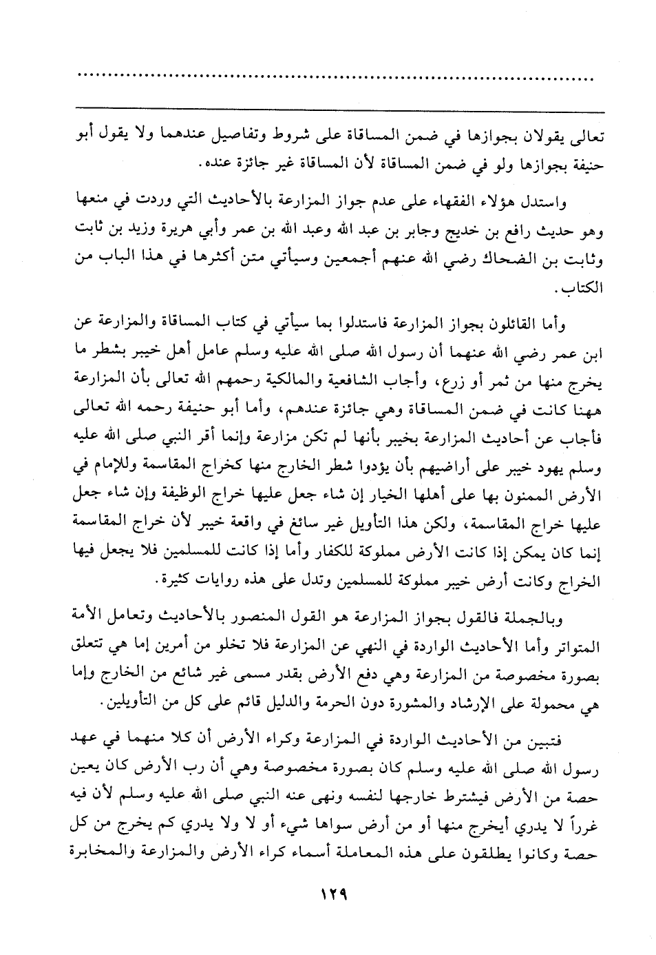 وأما القائلون بجواز المزارعة فاستدلوا بما سيأتي في كتاب المساقاة والمزارعة عن ابن عمر رضي الله عنهما أن رسول الله صلى الله عليه وسلم عامل أهل خيبر بشطر ما يخرج منها من ثمر أو زرع، وأجاب الشافعية والمالكية رحمهم الله تعالى بأن المزارعة ها هنا كانت في ضمن المساقاة وهي جائزة عندهم، وأما أبو حنيفة رحمه الله تعالى فأجاب عن أحاديث المزارعة بخيبر بأنها لم تكن مزارعة وإنما أقر النبي صلى الله عليه وسلم يهود خيبر على أراضيهم بأن يؤدوا شطر الخارج منها كخراج المقاسمة وللإمام في الأرض الممنون بها على أهلها الخيار إن شاء جعل عليها خراج الوظيفة وإن شاء جعل عليها خراج المقاسمة، ولكن هذا التأويل غير سائغ في واقعة خيبر لأن خراج المقاسمة إنما كان يمكن إذا كانت الأرض مملوكة للكفار وأما إذا كانت للمسلمين فلا يجعل فيها الخراج وكانت أرض خيبر مملوكة للمسلمين وتدل على هذه روايات كثيرة.
