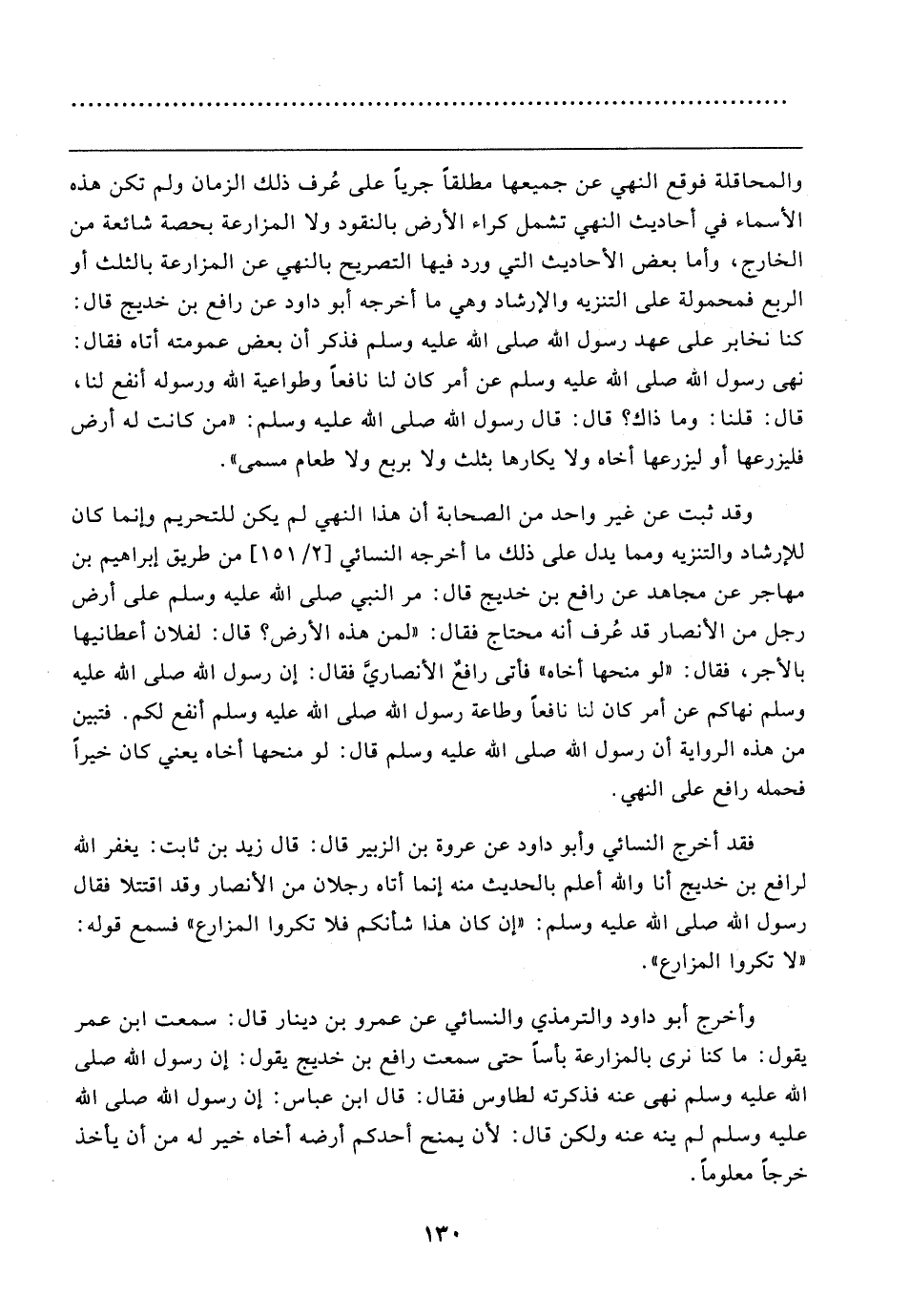 والمحاقلة فوقع النهي عن جميعها مطلقًا جريًا على عُرف ذلك الزمان ولم تكن هذه الأسماء في أحاديث النهي تشمل كراء الأرض بالنقود ولا المزارعة بحصة شائعة من الخارج، وأما بعض الأحاديث التي ورد فيها التصريح بالنهي عن المزارعة بالثلث أو الربع فمحمولة على التنزيه والإرشاد وهي ما أخرجه أبو داود عن رافع بن خديج قال: كنا نخابر على عهد رسول الله صلى الله عليه وسلم فذكر أن بعض عمومته أتاه فقال: نهى رسول الله صلى الله عليه وسلم عن أمر كان لنا نافعًا وطواعية الله ورسوله أنفع لنا، قال: قلنا: وما ذاك؟ قال: قال رسول الله صلى الله عليه وسلم: "من كانت له أرض فليزرعها أو ليزرعها أخاه ولا يكارها بثلث ولا بربع ولا طعام مسمى".