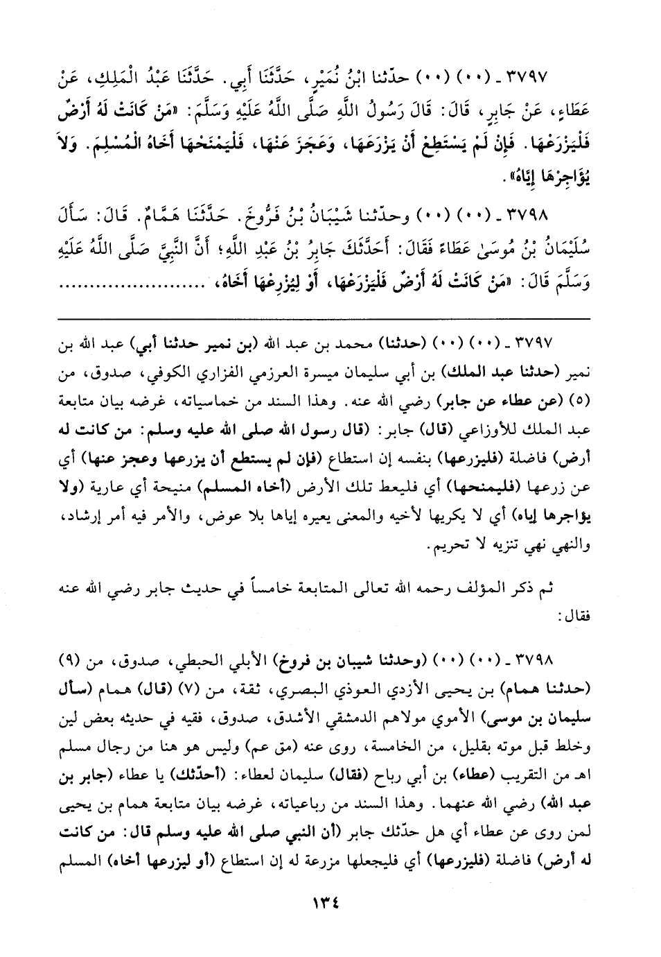 ٣٧٩٨ - (٠٠) (٠٠) (وحدثنا شيبان بن فروخ) الأبلي الحبطي، صدوق، من (٩) (حدثنا همام) بن يحيى الأزدي العوذي البصري، ثقة، من (٧) (قال) همام (سأل سليمان بن موسى) الأموي مولاهم الدمشقي الأشدق، صدوق، فقيه في حديثه بعض لين وخلط قبل موته بقليل، من الخامسة، روى عنه (من عم) وليس هو هنا من رجال مسلم اهـ من التقريب (عطاء) بن أبي رباح (فقال) سليمان لعطاء: (أحدّثك) يا عطاء (جابر بن عبد الله) رضي الله عنهما. وهذا السند من رباعياته، غرضه بيان متابعة همام بن يحيى لمن روى عن عطاء أي هل حدثك جابر (أن النبي صلى الله عليه وسلم قال: من كانت له أرض) فاضلة (فليزرعها) أي فليجعلها مزرعة له إن استطاع (أو ليزرعها أخاه) المسلم