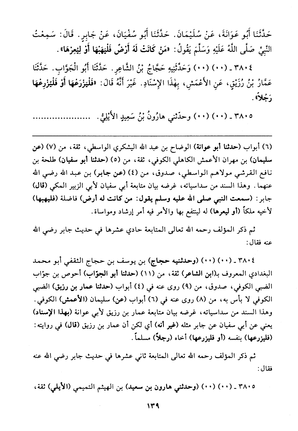 ٣٨٠٤ - (٠٠) (٠٠) (وحدثنيه حجاج) بن يوسف بن حجاج الثقفي أبو محمد البغدادي المعروف بـ (ابن الشاعر) ثقة، من (١١) (حدثنا أبو الجواب) أحوص بن جواب الضبي الكوفي، صدوق، من (٩) روى عنه في (٤) أبواب (حدثنا عمار بن رزيق) الضبي الكوفي لا بأس به، من (٨) روى عنه في (٦) أبواب (عن) سليمان (الأعمش) الكوفي. وهذا السند من سداسياته، غرضه بيان متابعة عمار بن رزيق لأبي عوانة (بهذا الإسناد) يعني عن أبي سفيان عن جابر مثله (غير أنه) أي لكن أن عمار بن رزيق (قال) في روايته: (فليزرعها) بنفسه (أو فليزرعها) أخاه (رجلًا) مسلمًا.