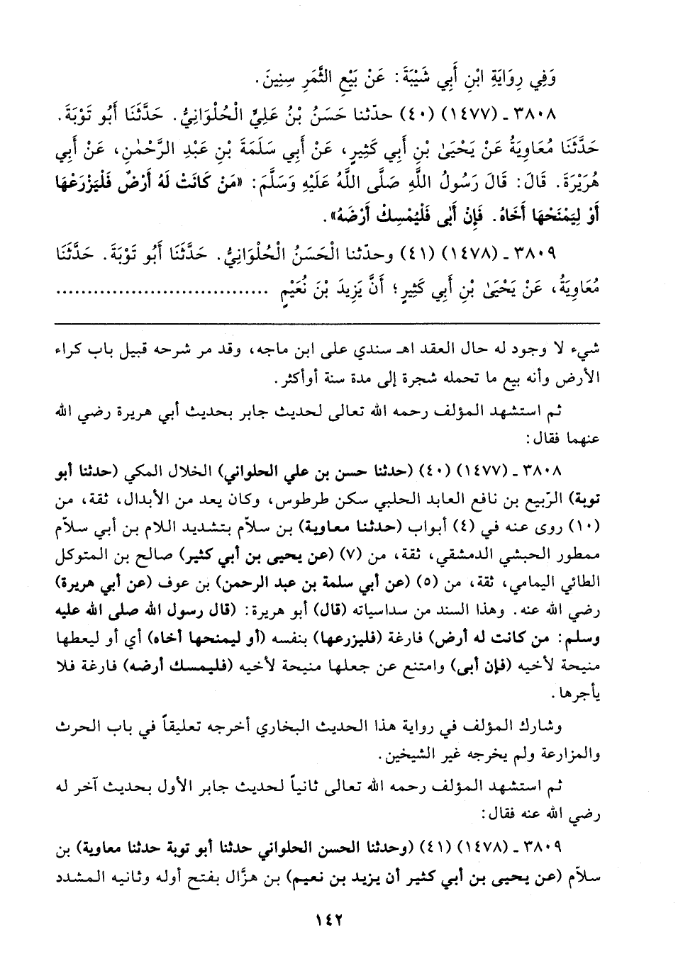 ٣٨٠٨ - (١٤٧٧) (٤٠) (حدثنا حسن بن علي الحلواني) الخلال المكي (حدثنا أبو توبة) الربيع بن نافع العابد الحلبي سكن طرطوس، وكان يعد من الأبدال، ثقة، من (١٠) روى عنه في (٤) أبواب (حدثنا معاوية) بن سلام بتشديد اللام بن أبي سلام ممطور الحبشي الدمشقي، ثقة، من (٧) (عن يحيى بن أبي كثير) صالح بن المتوكل الطائي اليمامي، ثقة، من (٥) (عن أبي سلمة بن عبد الرحمن) بن عوف (عن أبي هريرة) رضي الله عنه. وهذا السند من سداسياته (قال) أبو هريرة: (قال رسول الله صلى الله عليه وسلم: من كانت له أرض) فارغة (فليزرعها) بنفسه (أو ليمنحها أخاه) أي أو ليعطها منيحة لأخيه (فإن أبي) وامتنع عن جعلها منيحة لأخيه (فليمسك أرضه) فارغة فلا يأجرها.