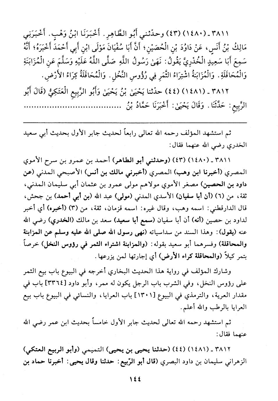 ٣٨١١ - (٤٨٠ ١) (٤٣) (وحدثني أبو الطاهر) أحمد بن عمرو بن سرح الأموي المصري (أخبرنا ابن وهب) المصري (أخبرني مالك بن أنس) الأصبحي المدني (عن داود بن الحصين) مصغر الأموي مولاهم مولى عمرو بن عثمان أبي سليمان المدني، ثقة، من (٦) (أن أبا سفيان) الأسدي المدني (مولى) عبد الله (بن أبي أحمد) بن جحش، قال الدارقطني: اسمه وهب، وقال غيره: اسمه قزمان، ثقة، من (٣) (أخبره) أي أخبر لداود بن حصين (أنه) أن أبا سفيان (سمع أبا سعيد) سعد بن مالك (الخدري) رضي الله عنه (يقول): وهذا السند من سداسياته (نهى رسول الله صلى الله عليه وسلم عن المزابنة والمحاقلة) وفسرهما أبو سعيد بقوله: (والمزابنة اشتراء الثمر في رووس النخل) خرصًا بتمر كيلًا (والمحاقلة كراء الأرض) أي إجارتها لمن يزرعها.