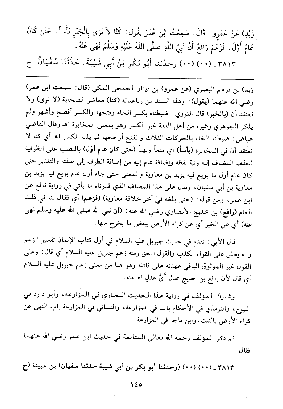 زَيدٍ) عَنْ عَمْرٍو. قَال: سَمِعْتُ ابْنَ عُمَرَ يَقُولُ: كُنا لَا نَرَى بِالْخِبْرِ بَأسًا. حَتى كَانَ عَامُ أَولَ. فَزَعَمَ رَافِعٌ أن نَبِي الله صلى الله عَلَيهِ وَسَلمَ نَهَى عَنْهُ.