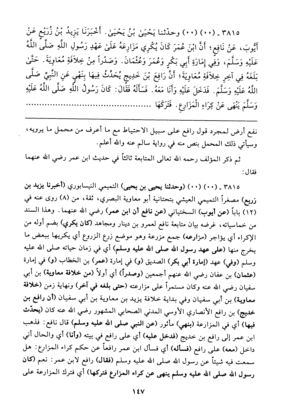 ٣٨١٥ - (٠٠) (٠٠) وحدثنا يَحْيَى بْنُ يَحْيَى. أخْبَرَنَا يَزِيدُ بْنُ زُريعٍ عَنْ أَيُّوبَ، عَنْ نَافِعٍ؛ أَنَّ ابْنَ عُمَرَ كَانَ يُكْرِي مَزَارِعَهُ عَلَى عَهْدِ رَسُولِ اللَّهِ صَلَّى اللهُ عَلَيهِ وَسَلَّمَ، وَفِي إِمَارَةِ أَبِي بَكْرٍ وَعُمَرَ وَعُثْمَانَ. وَصَدْرا مِنْ خِلافَةِ مُعَاويَةَ. حَتَّى بَلَغَهُ فِي آخِرِ خِلافَةِ مُعَاويةَ؛ أَنَّ رَافِعَ بْنَ خَدِيجٍ يُحَدِّثُ فِيهَا بِنَهْي عَنِ النَّبِي صَلى اللهُ عَلَيهِ وَسَلَّمَ. فَدَخَلَ عَلَيهِ وَأَنَا مَعَهُ. فَسَأَلَهُ فَقَال: كَانَ رَسُولُ الله صَلَّى اللَّهُ عَلَيهِ وَسَلَّمَ يَنْهَى عَنْ كِرَاءِ الْمَزَارعِ. فَتَرَكَهَا