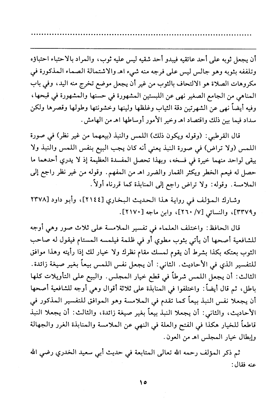 قال الحافظ: واختلف العلماء في تفسير الملامسة على ثلاث صور وهي أوجه للشافعية أصحها أن يأتي بثوب مطوي أو في ظلمة فيلمسه المستام فيقول له صاحب الثوب بعتكه بكذا بشرط أن يقوم لمسك مقام نظرك ولا خيار لك إذا رأيته وهذا موافق للتفسير الذي في الأحاديث. الثاني: أن يجعل نفس اللمس بيعًا بغير صيغة زائدة. الثالث: أن يجعل اللمس شرطًا في قطع خيار المجلس. والبيع على التأويلات كلها باطل، ثم قال أيضًا: واختلفوا في المنابذة على ثلاثة أقوال وهي أوجه للشافعية أصحها أن يجعلا نفس النبذ بيعًا كما تقدم في الملامسة وهو الموافق للتفسير المذكور في الأحاديث، والثاني: أن يجعلا النبذ بيعًا بغير صيغة زائدة، والثالث: أن يجعلا النبذ قاطعًا للخيار هكذا في الفتح والعلة في النهي عن الملامسة والمنابذة الغرر والجهالة وإبطال خيار المجلس اهـ من العون.