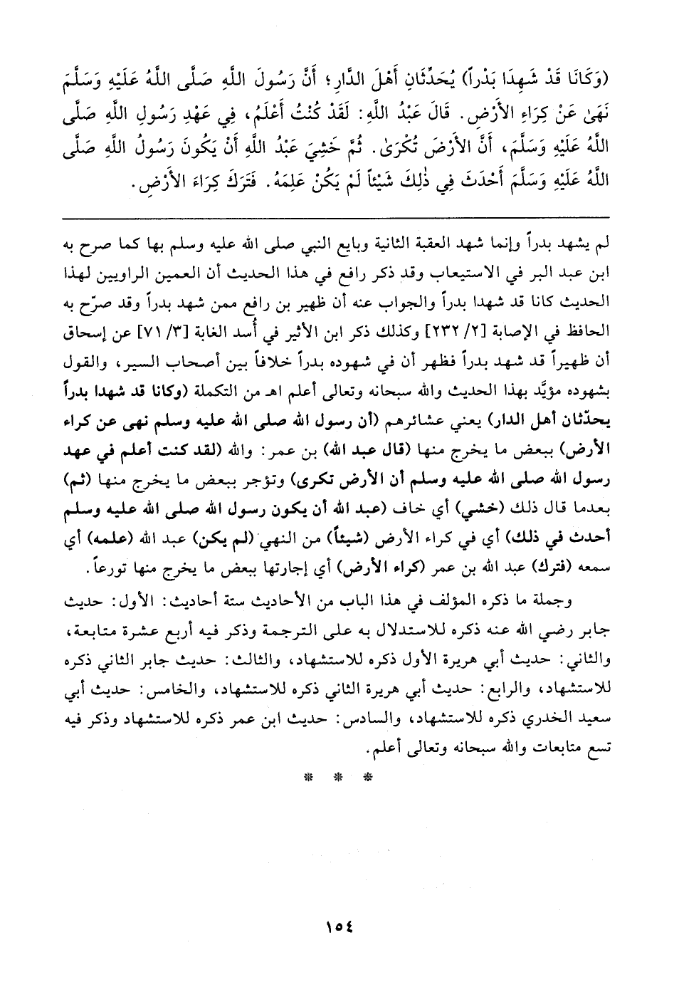 (وَكَانَا قَدْ شَهِدَا بَدْرًا) يُحَدثَانِ أَهْلَ الدارِ؛ أن رَسُولَ الله صلى اللهُ عَلَيهِ وَسَلمَ نَهَى عَنْ كِرَاءِ الأرضِ. قَال عَبْدُ الله: لَقَدْ كُنتُ أَعْلَمُ، فِي عَهْدِ رَسُولِ الله صلى الله عَلَيهِ وَسَلمَ، أَن الأرضَ تُكْرَى. ثم خَشِيَ عَبْدُ الله أَنْ يَكُونَ رَسُولُ الله صلى الله عَلَيهِ وَسَلمَ أَحْدَثَ فِي ذلِكَ شَيئًا لَمْ يَكُنْ عَلِمَهُ. فَتَرَكَ كِرَاءَ الأرضِ
