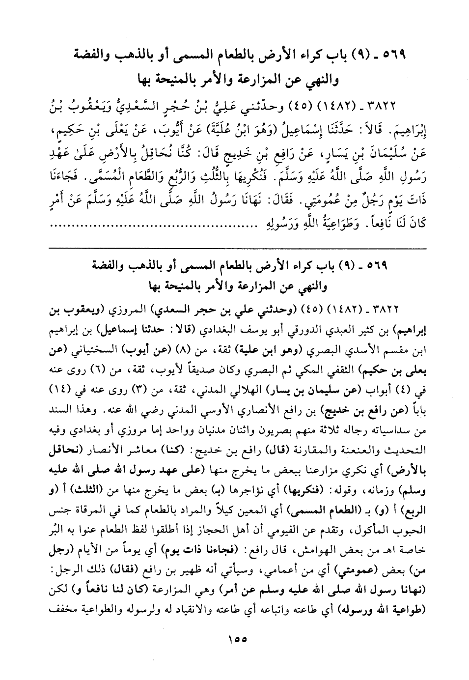 ٣٨٢٢ - (١٤٨٢) (٤٥) (وحدثني علي بن حجر السعدي) المروزي (ويعقوب بن إبراهيم) بن كثير العبدي الدورقي أبو يوسف البغدادي (قالا: حدثنا إسماعيل) بن إبراهيم بن مقسم الأسدي البصري (وهو ابن علية) ثقة، من (٨) (عن أيوب) السختياني (عن يعلى بن حكيم) الثقفي المكي ثم البصري وكان صديقًا لأيوب، ثقة، من (٦) روى عنه في (٤) أبواب (عن سليمان بن يسار) الهلالي المدني، ثقة، من (٣) روى عنه في (١٤) بابا (عن رافع بن خديج) بن رافع الأنصاري الأوسي المدني رضي الله عنه. وهذا السند من سداسياته رجاله ثلاثة منهم بصريون واثنان مدنيان وواحد إما مروزي أو بغدادي وفيه التحديث والعنعنة والمقارنة (قال) رافع بن خديج: (كنا) معاشر الأنصار (نحاقل بالأرض) أي نكري مزارعنا ببعض ما يخرج منها (على عهد رسول الله صلى الله عليه وسلم) وزمانه، وقوله: (فنكريها) أي نؤاجرها (بـ) بعض ما يخرج منها من (الثلث) أ (والربع) أ (و) بـ (الطعام المسمى) أي المعين كيلًا والمراد بالطعام كما في المرقاة جنس الحبوب المأكول، وتقدم عن الفيومي أن أهل الحجاز إذا أطلقوا لفظ الطعام عنوا به البُر خاصة اهـ من بعض الهوامش، قال رافع: (فجاءنا ذات يوم) أي يومًا من الأيام (رجل من) بعض (عمومتي) أي من أعمامي، وسيأتي أنه ظهير بن رافع (فقال) ذلك الرجل: (نهانا رسول الله صلى الله عليه وسلم عن أمر) وهي المزارعة (كان لنا نافعًا و) لكن (طواعية الله ورسوله) أي طاعته واتباعه أي طاعته والانقياد له ولرسوله والطواعية مخفف