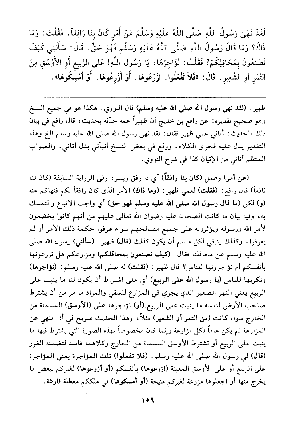 ظهير: (لقد نهى رسول الله صلى الله عليه وسلم) قال النووي: هكذا هو في جميع النسخ وهو صحيح تقديره: عن رافع بن خديج أن ظهيرًا عمه حدَّثه بحديث، قال رافع في بيان ذلك الحديث: أتاني عمي ظهير فقال: لقد نهى رسول الله صلى الله عليه وسلم الخ وهذا التقدير يدل عليه فحوى الكلام، ووقع في بعض النسخ أنباني بدل أتاني، والصواب المنتظم أتاني من الإتيان كذا في شرح النووي.