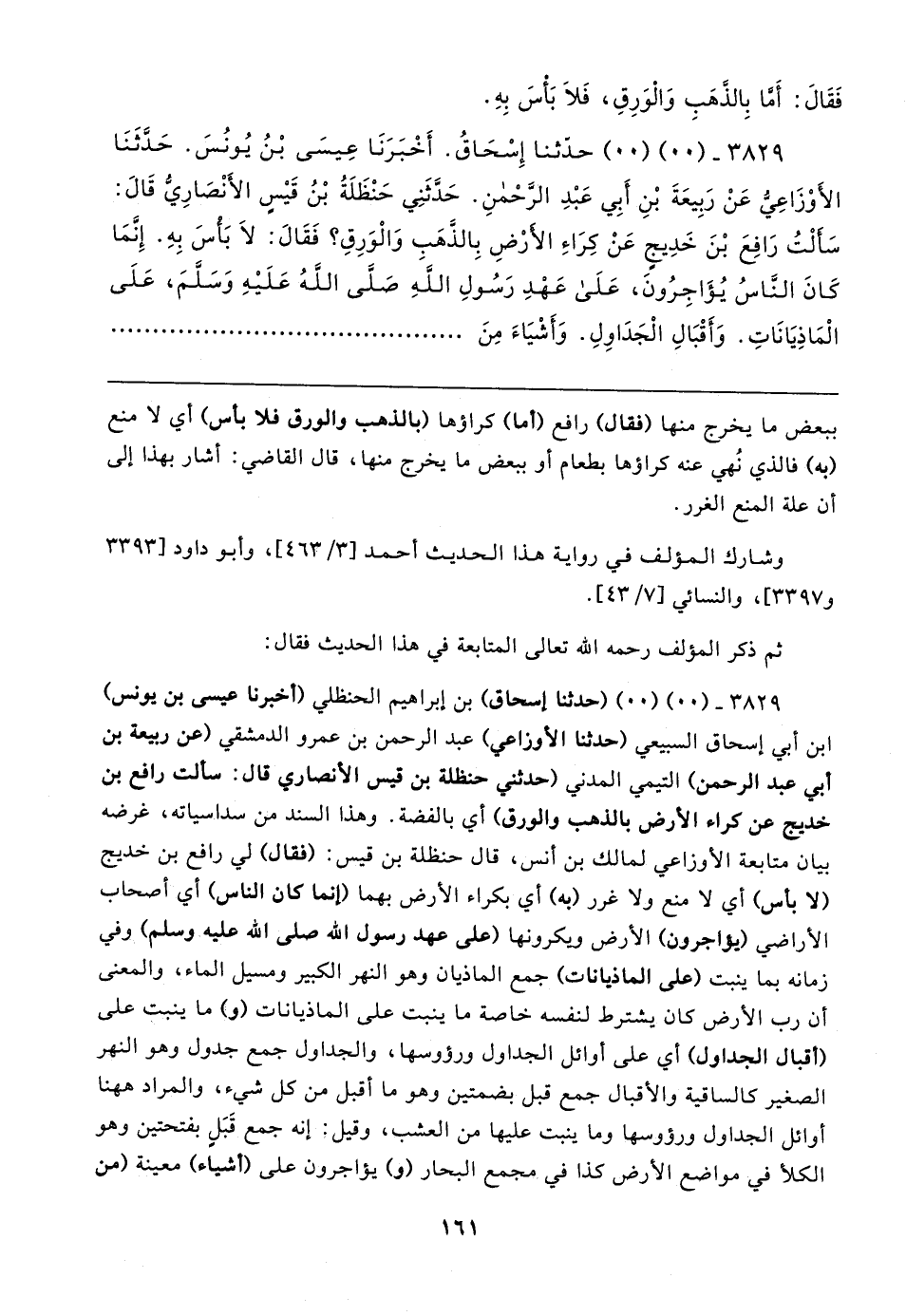 ٣٨٢٩ - (٠٠) (٠٠) (حدثنا إسحاق) بن إبراهيم الحنظلي (أخبرنا عيسى بن يونس) ابن أبي إسحاق السبيعي (حدثنا الأوزاعي) عبد الرحمن بن عمرو الدمشقي (عن ربيعة بن أبي عبد الرحمن) التيمي المدني (حدثني حنظلة بن قيس الأنصاري قال: سألت رافع بن خديج عن كراء الأرض بالذهب والورق) أي بالفضة. وهذا السند من سداسياته، غرضه بيان متابعة الأوزاعي لمالك بن أنس، قال حنظلة بن قيس: (فقال) لي رافع بن خديج (لا بأس) أي لا منع ولا غرر (به) أي بكراء الأرض بهما (إنما كان الناس) أي أصحاب الأراضي (يؤاجرون) الأرض ويكرونها (على عهد رسول الله صلى الله عليه وسلم) وفي زمانه بما ينبت (على الماذيانات) جمع الماذيان وهو النهر الكبير ومسيل الماء، والمعنى أن رب الأرض كان يشترط لنفسه خاصة ما ينبت على الماذيانات (و) ما ينبت على (أقبال الجداول) أي على أوائل الجداول ورؤوسها، والجداول جمع جدول وهو النهر الصغير كالساقية والأقبال جمع قبل بضمتين وهو ما أقبل من كل شيء، والمراد ها هنا أوائل الجداول ورؤوسها وما ينبت عليها من العشب، وقيل: إنه جمع قَبَلٍ بفتحتين وهو الكلأ في مواضع الأرض كذا في مجمع البحار (و) يؤاجرون على (أشياء) معينة (من