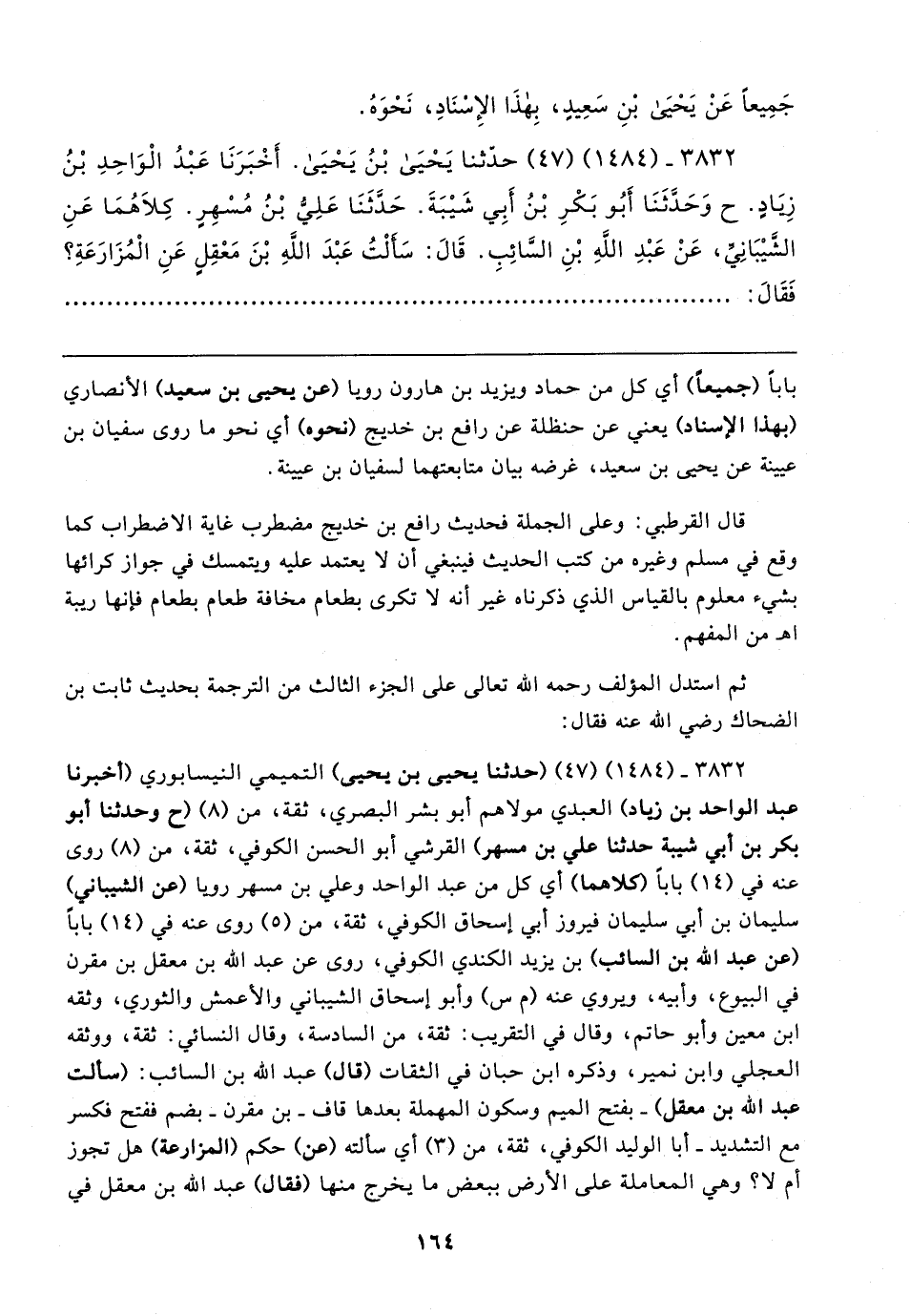 ٣٨٣٢ - (١٤٨٤) (٤٧) (حدثنا يحيى بن يحيى) التميمي النيسابوري (أخبرنا عبد الواحد بن زياد) العبدي مولاهم أبو بشر البصري، ثقة، من (٨) (ح وحدثنا أبو بكر بن أبي شيبة حدثنا علي بن مسهر) القرشي أبو الحسن الكوفي، ثقة، من (٨) روى عنه في (١٤) بابًا (كلاهما) أي كل من عبد الواحد وعلي بن مسهر رويا (عن الشيباني) سليمان بن أبي سليمان فيروز أبي إسحاق الكوفي، ثقة، من (٥) روى عنه في (١٤) بابا (عن عبد الله بن السائب) بن يزيد الكندي الكوفي، روى عن عبد الله بن معقل بن مقرن في البيوع، وأبيه، ويروي عنه (م س) وأبو إسحاق الشيباني والأعمش والثوري، وثقه ابن معين وأبو حاتم، وقال في التقريب: ثقة، من السادسة، وقال النسائي: ثقة، ووثقه العجلي وابن نمير، وذكره ابن حبان في الثقات (قال) عبد الله بن السائب: (سالت عبد الله بن معقل) -بفتح الميم وسكون المهملة بعدها قاف- بن مقرن -بضم ففتح فكسر مع التشديد- أبا الوليد الكوفي، ثقة، من (٣) أي سألته (عن) حكم (المزارعة) هل تجوز أم لا؟ وهي المعاملة على الأرض ببعض ما يخرج منها (فقال) عبد الله بن معقل في
