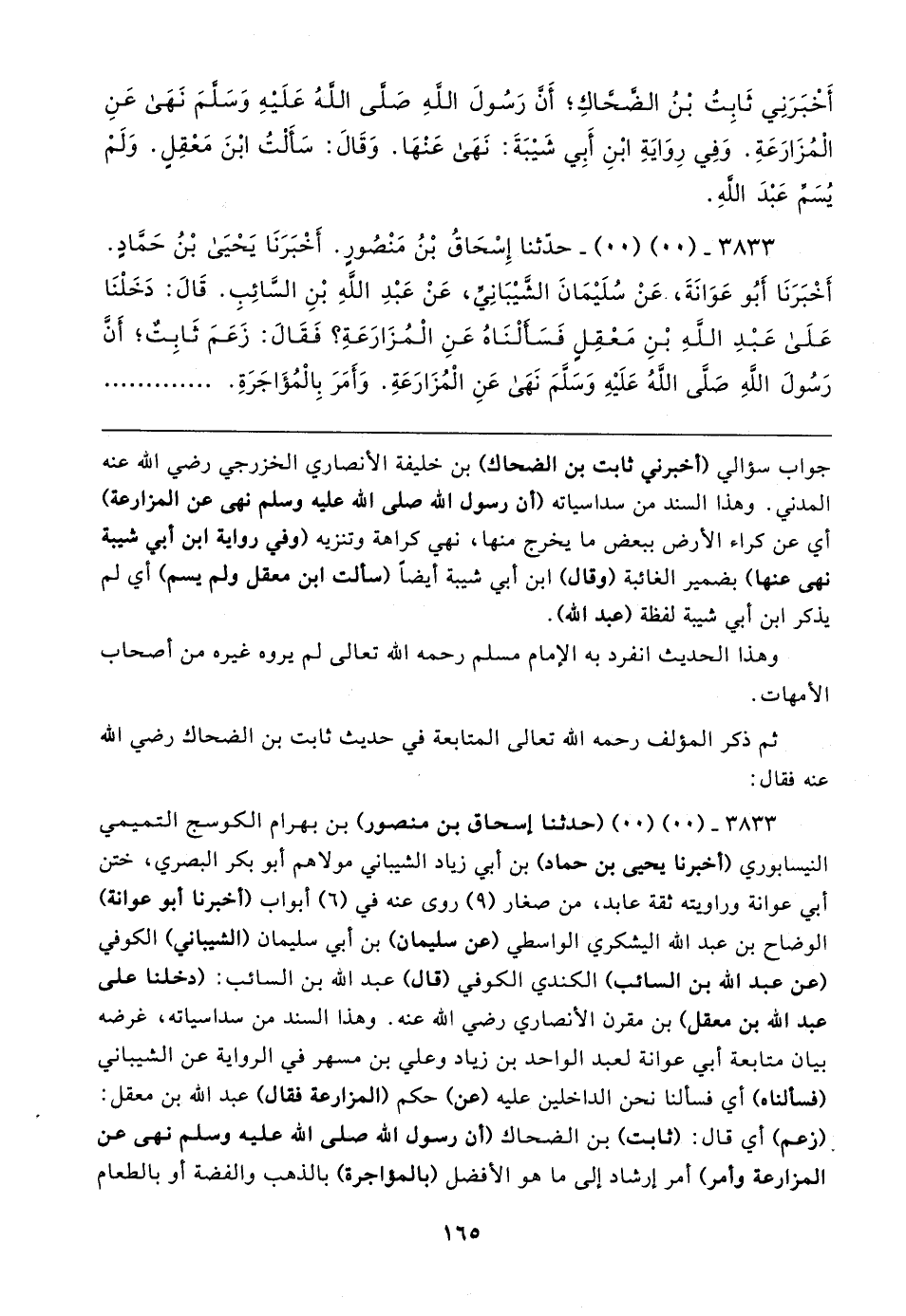 ٣٨٣٣ - (٠٠) (٠٠) حدثنا إسحاق بن منصور) بن بهرام الكوسج التميمي النيسابوري (أخبرنا يحيى بن حماد) بن أبي زياد الشيباني مولاهم أبو بكر البصري، ختن أبي عوانة وراويته ثقة عابد، من صغار (٩) روى عنه في (٦) أبواب (أخبرنا أبو عوانة) الوضاح بن عبد الله اليشكري الواسطي (عن سليمان) بن أبي سليمان (الشيباني) الكوفي (عن عبد الله بن السائب) الكندي الكوفي (قال) عبد الله بن السائب: (دخلنا على عبد الله بن معقل) بن مقرن الأنصاري رضي الله عنه. وهذا السند من سداسياته، غرضه بيان متابعة أبي عوانة لعبد الواحد بن زياد وعلي بن مسهر في الرواية عن الشيباني (فسألناه) أي فسألنا نحن الداخلين عليه (عن) حكم (المزارعة فقال) عبد الله بن معقل: (زعم) أي قال: (ثابت) بن الضحاك (أن رسول الله صلى الله عليه وسأنهى عن المزارعة وأمر) أمر إرشاد إلى ما هو الأفضل (بالمؤاجرة) بالذهب والفضة أو بالطعام