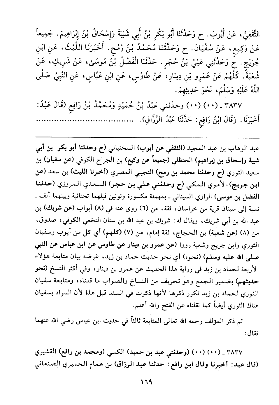 عبد الوهاب بن عبد المجيد (الثقفي عن أيوب) السختياني (ح وحدثنا أبو بكر بن أبي شيبة وإسحاق بن إبراهيم) الحنظلي (جميعًا عن وكيع) بن الجراح الكوفي (عن سفيان) بن سعيد الثوري (ح وحدثنا محمد بن رمح) التجيبي المصري (أخبرنا الليث) بن سعد (عن ابن جريج) الأموي المكي (ح وحدثني علي بن حجر) السعدي المروزي (حدثنا الفضل بن موسى) الرازي السيناني -بمهملة مكسورة ونونين قبلهما تحتانية وبينهما ألف- نسبة إلى سينان قرية من خراسان، ثقة، من (٦) روى عنه في (٨) أبواب (عن شريك) بن عبد الله بن أبي شريك، ويقال له: شريك بن عبد الله بن سنان النخعي الكوفي، صدوق، من (٨) (عن شعبة) بن الحجاج، ثقة إمام، من (٧) (لهم) أي كل من أيوب وسفيان الثوري وابن جريج وشعبة رووا (عن عمرو بن دينار عن طاوس عن ابن عباس عن النبي صلى الله عليه وسلم) (نحوه) أي نحو حديث حماد بن زيد، غرضه بيان متابعة هؤلاء الأربعة لحماد بن زيد في رواية هذا الحديث عن عمرو بن دينار، وفي أكثر النسخ (نحو حديثهم) بضمير الجمع وهو تحريف من النساخ والصواب ما قلناه، ومتابعة سفيان الثوري لحماد بن زيد تكرر ذكرها لأنها ذكرت في السند قبل هذا لأن المراد بسفيان هناك الثوري أيضًا كما نقلناه عن الفتح والله أعلم.