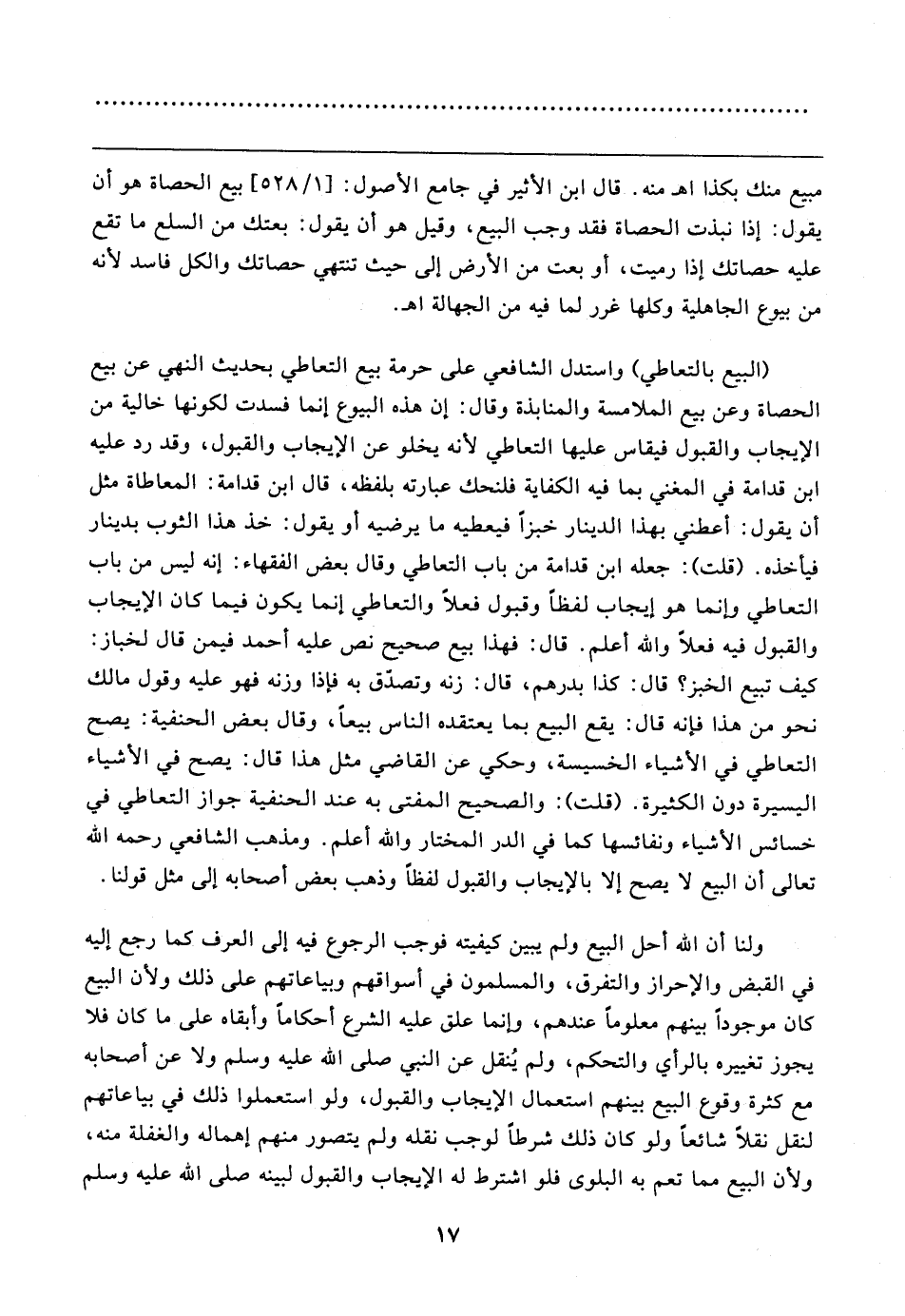 (البيع بالتعاطي) واستدل الشافعي على حرمة بيع التعاطي بحديث النهي عن بيع الحصاة وعن بيع الملامسة والمنابذة وقال: إن هذه البيوع إنما فسدت لكونها خالية من الإيجاب والقبول فيقاس عليها التعاطي لأنه يخلو عن الإيجاب والقبول، وقد رد عليه ابن قدامة في المغني بما فيه الكفاية فلنحك عبارته بلفظه، قال ابن قدامة: المعاطاة مثل أن يقول: أعطني بهذا الدينار خبزًا فيعطيه ما يرضيه أو يقول: خذ هذا الثوب بدينار فيأخذه. (قلت): جعله ابن قدامة من باب التعاطي وقال بعض الفقهاء: إنه ليس من باب التعاطي وإنما هو إيجاب لفظًا وقبول فعلًا والتعاطي إنما يكون فيما كان الإيجاب والقبول فيه فعلًا والله أعلم. قال: فهذا بيع صحيح نص عليه أحمد فيمن قال لخباز: كيف تبيع الخبز؟ قال: كذا بدرهم، قال: زنه وتصدق به فإذا وزنه فهو عليه وقول مالك نحو من هذا فإنه قال: يقع البيع بما يعتقده الناس بيعًا، وقال بعض الحنفية: يصح التعاطي في الأشياء الخسيسة، وحكي عن القاضي مثل هذا قال: يصح في الأشياء اليسيرة دون الكثيرة. (قلت): والصحيح المفتى به عند الحنفية جواز التعاطي في خسائس الأشياء ونفائسها كما في الدر المختار والله أعلم. ومذهب الشافعي رحمه الله تعالى أن البيع لا يصح إلا بالإيجاب والقبول لفظًا وذهب بعض أصحابه إلى مثل قولنا.