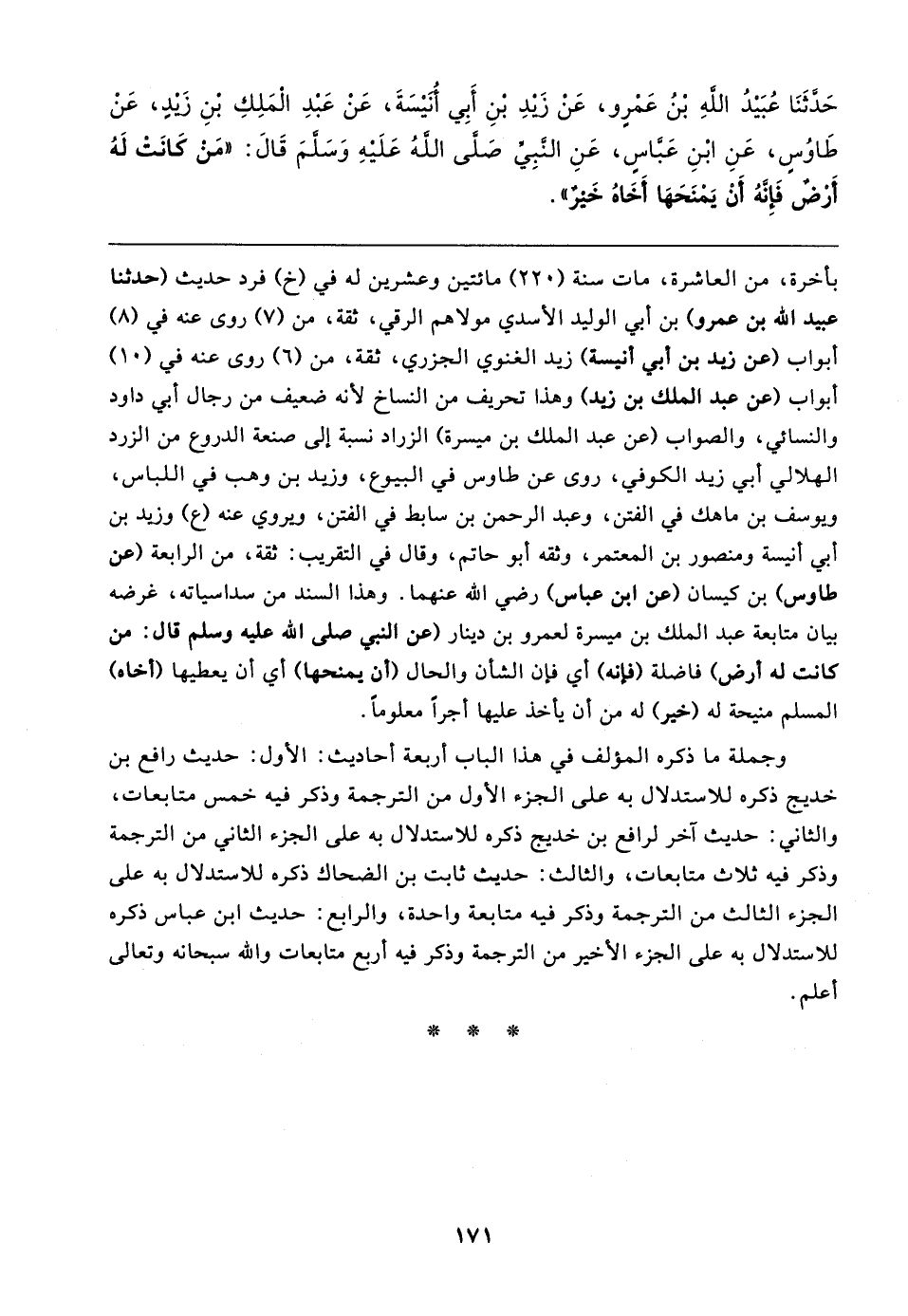 حَدَّثَنَا عُبَيدُ الله بْنُ عَمْرٍو، عَنْ زَيدِ بنِ أَبِي أنيسَةَ، عَنْ عَبدِ المَلِكِ بنِ زَيدٍ، عَنْ طَاوُسٍ، عَنِ ابْنِ عَبَّاسٍ، عَنِ النَّبِيّ صلى الله عَلَيهِ وَسَلمَ قَال: "مَن كَانَتْ لَهُ أَرْضٌ فَإِنهُ أَنْ يَمْنَحَهَا أَخَاهُ خَيْرٌ"