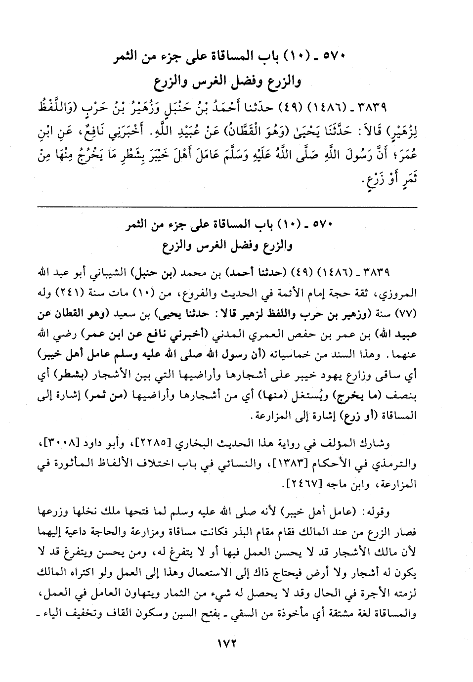 ٣٨٣٩ - (١٤٨٦) (٤٩) (حدثنا أحمد) بن محمد (بن حنبل) الشيباني أبو عبد الله المروزي، ثقة حجة إمام الأئمة في الحديث والفروع، من (١٠) مات سنة (٢٤١) وله (٧٧) سنة (وزهير بن حرب واللفظ لزهير قالا: حدثنا يحيى) بن سعيد (وهو القطان عن عبيد الله) بن عمر بن حفص العمري المدني (أخبرني نافع عن ابن عمر) رضي الله عنهما. وهذا السند من خماسياته (أن رسول الله صلى الله عليه وسلم عامل أهل خيبر) أي ساقى وزارع يهود خيبر على أشجارها وأراضيها التي بين الأشجار (بشطر) أي بنصف (ما يخرج) ويُستغل (منها) أي من أشجارها وأراضيها (من ثمر) إشارة إلى المساقاة (أو زرع) إشارة إلى المزارعة.