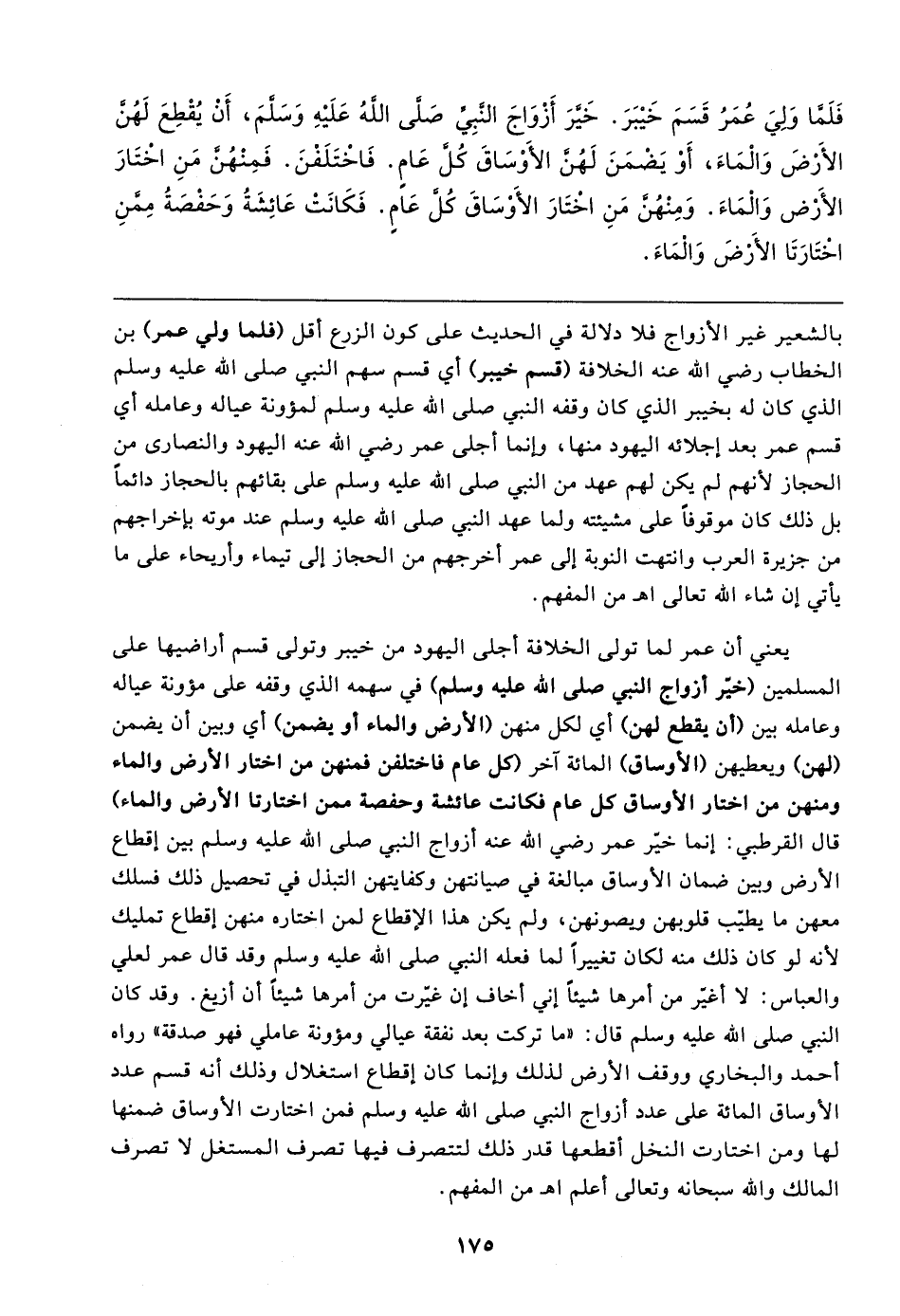 يعني أن عمر لما تولى الخلافة أجلى اليهود من خيبر وتولى قسم أراضيها على المسلمين (خيَّر أزواج النبي صلى الله عليه وسلم) في سهمه الذي وقفه على مؤونة عياله وعامله بين (أن يقطع لهن) أي لكل منهن (الأرض والماء أو يضمن) أي وبين أن يضمن (لهن) ويعطيهن (الأوساق) المائة آخر (كل عام فاختلفن فمنهن من اختار الأرض والماء ومنهن من اختار الأوساق كل عام فكانت عائشة وحفصة ممن اختارتا الأرض والماء) قال القرطبي: إنما خيَّر عمر رضي الله عنه أزواج النبي صلى الله عليه وسلم بين إقطاع الأرض وبين ضمان الأوساق مبالغة في صيانتهن وكفايتهن التبذل في تحصيل ذلك فسلك معهن ما يطيب قلوبهن ويصونهن، ولم يكن هذا الإقطاع لمن اختاره منهن إقطاع تمليك لأنه لو كان ذلك منه لكان تغييرًا لما فعله النبي صلى الله عليه وسلم وقد قال عمر لعلي والعباس: لا أغيّر من أمرها شيئًا إني أخاف إن غيّرت من أمرها شيئًا أن أزيغ. وقد كان النبي صلى الله عليه وسلم قال: "ما تركت بعد نفقة عيالي ومؤونة عاملي فهو صدقة" رواه أحمد والبخاري ووقف الأرض لذلك وإنما كان إقطاع استغلال وذلك أنه قسم عدد الأوساق المائة على عدد أزواج النبي صلى الله عليه وسلم فمن اختارت الأوساق ضمنها لها ومن اختارت النخل أقطعها قدر ذلك لتتصرف فيها تصرف المستغل لا تصرف المالك والله سبحانه وتعالى أعلم اهـ من المفهم.