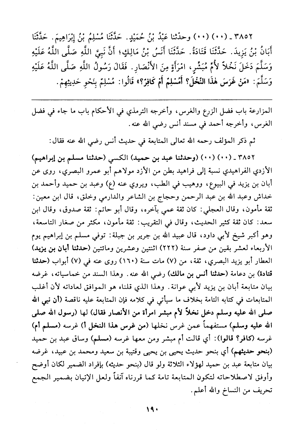 ٣٨٥٢ - (٠٠) (٠٠) (وحدثنا عبد بن حميد) الكسي (حدثنا مسلم بن إبراهيم) الأزدي الفراهيدي نسبة إلى فراهيد بطن من الأزد مولاهم أبو عمرو البصري، روى عن أبان بن يزيد في البيوع، ووهيب في الطب، ويروي عنه (ع) وعبد بن حميد وأحمد بن خداش وعبد الله بن عبد الرحمن وحجاج بن الشاعر والدارمي وخلق، قال ابن معين: ثقة مأمون، وقال العجلي: كان ثقة عمي بآخره، وقال أبو حاتم: ثقة صدوق، وقال ابن سعد: كان ثقة كثير الحديث، وقال في التقريب: ثقة مأمون، مكثر من صغار التاسعة، وهو أكبر شيخ لأبي داود، قال عبيد الله بن جرير بن جبلة: توفي مسلم بن إبراهيم يوم الأربعاء لعشر بقين من صفر سنة (٢٢٢) اثنتين وعشرين ومائتين (حدثنا أبان بن يزيد) العطار أبو يزيد البصري، ثقة، من (٧) مات سنة (١٦٠) روى عنه في (٧) أبواب (حدثنا قتادة) بن دعامة (حدثنا أنس بن مالك) رضي الله عنه. وهذا السند من خماسياته، غرضه بيان متابعة أبان بن يزيد لأبي عوانة. وهذا الذي قلناه هو الموافق لعاداته لأن أغلب المتابعات في كتابه التامة بخلاف ما سيأتي في كلامه فإن المتابعة عليه ناقصة (أن نبي الله صلى الله عليه وسلم دخل نخلًا لأم مبشر امرأة من الأنصار فقال) لها (رسول الله صلى الله عليه وسلم) مستفهمًا عمن غرس نخلها (من غرس هذا النخل! ) غرسه (مسلم أم) غرسه (كافر؟ قالوا): أي قالت أم مبشر ومن معها غرسه (مسلم) وساق عبد بن حميد (بنحو حديثهم) أي بنحو حديث يحيى بن يحيى وقتيبة بن سعيد ومحمد بن عبيد، غرضه بيان متابعة عبد بن حميد لهؤلاء الثلاثة ولو قال (بنحو حديثه) بإفراد الضمير لكان أوضح وأوفق لاصطلاحاته لتكون المتابعة تامة كما قررناه آنفًا ولعل الإتيان بضمير الجمع تحريف من النساخ والله أعلم.