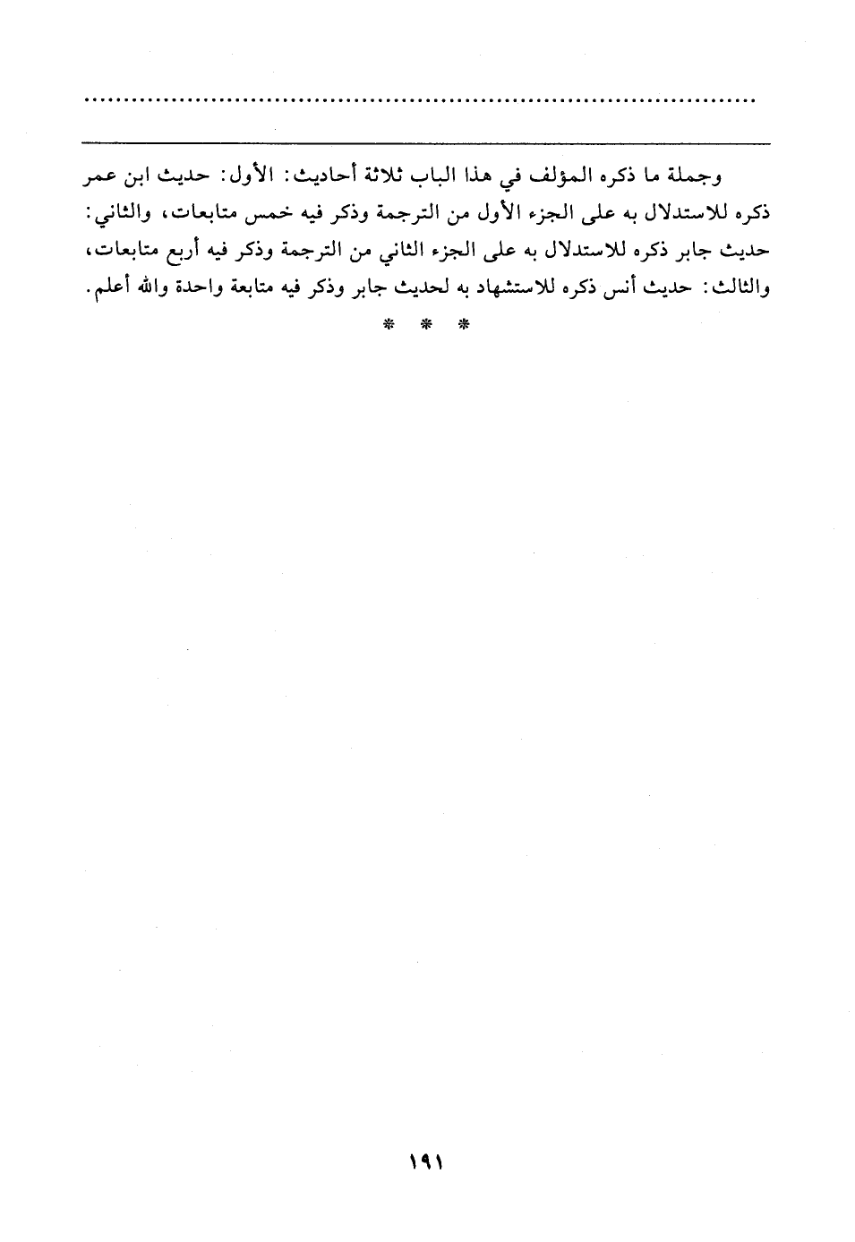 وجملة ما ذكره المؤلف في هذا الباب ثلاثة أحاديث: الأول: حديث ابن عمر ذكره للاستدلال به على الجزء الأول من الترجمة وذكر فيه خمس متابعات، والثاني: حديث جابر ذكره للاستدلال به على الجزء الثاني من الترجمة وذكر فيه أربع متابعات، والثالث: حديث أنس ذكره للاستشهاد به لحديث جابر وذكر فيه متابعة واحدة والله أعلم.