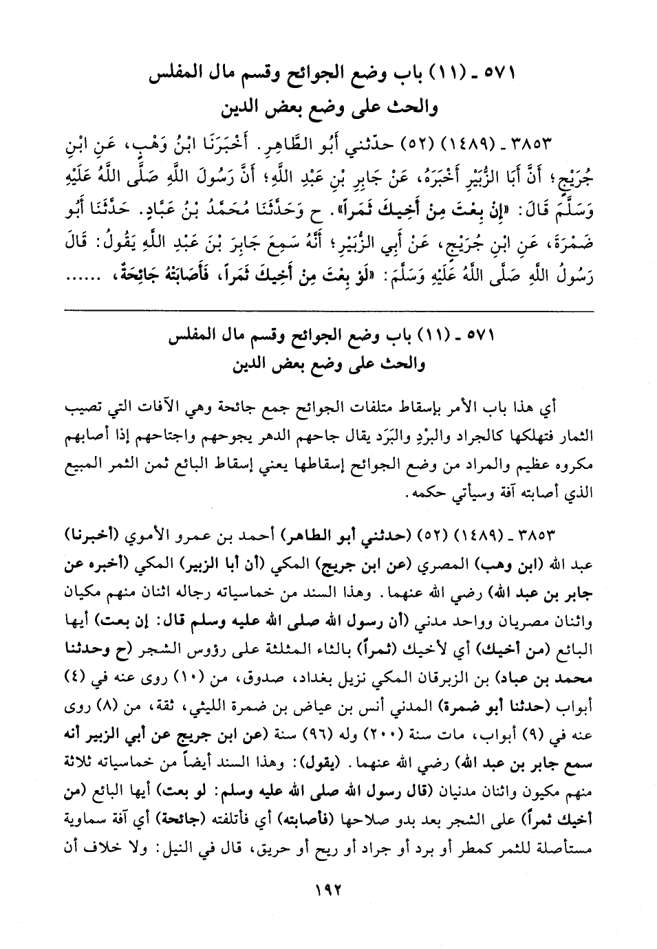 ٣٨٥٣ - (١٤٨٩) (٥٢) (حدثني أبو الطاهر) أحمد بن عمرو الأموي (أخبرنا) عبد الله (ابن وهب) المصري (عن ابن جريج) المكي (أن أبا الزبير) المكي (أخبره عن جابر بن عبد الله) رضي الله عنهما. وهذا السند من خماسياته رجاله اثنان منهم مكيان واثنان مصريان وواحد مدني (أن رسول الله صلى الله عليه وسلم قال: إن بعت) أيها البائع (من أخيك) أي لأخيك (ثمرًا) بالثاء المثلثة على رؤوس الشجر (ح وحدثنا محمد بن عباد) بن الزبرقان المكي نزيل بغداد، صدوق، من (١٠) روى عنه في (٤) أبواب (حدثنا أبو ضمرة) المدني أنس بن عياض بن ضمرة الليثي، ثقة، من (٨) روى عنه في (٩) أبواب، مات سنة (٢٠٠) وله (٩٦) سنة (عن ابن جريج عن أبي الزبير أنه سمع جابر بن عبد الله) رضي الله عنهما. (يقول): وهذا السند أيضًا من خماسياته ثلاثة منهم مكيون واثنان مدنيان (قال رسول الله صلى الله عليه وسلم: لو بعت) أيها البائع (من أخيك ثمرًا) على الشجر بعد بدو صلاحها (فأصابته) أي فأتلفته (جائحة) أي آفة سماوية مستأصلة للثمر كمطر أو برد أو جراد أو ريح أو حريق، قال في النيل: ولا خلاف أن