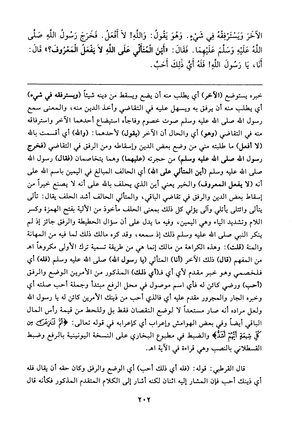 خبره يستوضع (الآخر) أي يطلب منه أن يضع ويسقط من دينه شيئًا (ويسترفقه في شيء) أي يطلب منه أن يرفق به ويسهل عليه في التقاضي وأخذ الدين منه، والمعنى سمع رسول الله صلى الله عليه وسلم صوت خصوم وفاجأه استيضاع أحدهما الآخر واسترفاقه منه في التقاضي (وهو) أي والحال أن الآخر (يقول) لأحدهما: (والله) أي أقسمت بالله (لا أفعل) ما طلبته مني من وضع بعض الدين وإسقاطه ومن الرفق في التقاضي (فخرج رسول الله صلى الله عليه وسلم) من حجرته (عليهما) وهما يتخاصمان (فقال) رسول الله صلى الله عليه وسلم (أين المتألي على الله) أي الحالف المبالغ في اليمين باسم الله على أنه (لا يفعل المعروف) والخير يعني أين الذي يحلف بالله على أنه لا يصنع خيرًا من إسقاط بعض الدين والرفق في تقاضي الباقي، والمتألي الحالف أشد الحلف يقال: تألى يتألى وائتلى يأتلي وآلى يؤلي كل ذلك بمعنى الحلف مأخوذ من الألية بفتح الهمزة وكسر اللام وتشديد الياء وهي اليمين، وفيه ما يدل على أن سؤال الحطيطة والرفق جائز إذ لم ينكر النبي صلى الله عليه وسلم ذلك إذ سمعه، وقد كره مالك ذلك لما فيه من المهانة والمنة (قلت): وهذه الكراهة من مالك إنما هي من طريقة تسمية ترك الأولى مكروهًا اهـ من المفهم (قال) ذلك الآخر (أنا) المتألي (يا رسول الله) صلى الله عليه وسلم (فله) أي فلخصمي وهو خبر مقدم لأي أي فـ (أي ذلك) المذكور من الأمرين الوضع والرفق (أحب) ورضي كائن له فأي اسم موصول في محل الرفع مبتدأ وجملة أحب صلته أي وخبره الجار والمجرور مقدم عليه أي فالذي أحب من ذينك الأمرين كائن له يا رسول الله ولعل مراده أنه صار مستعدًا لا لوضع النقصان فقط بل وللحط من قيمة رأس المال الباقي أيضًا وفي بعض الهوامش وإعراب أي كإعرابه في قوله تعالى: {ثُمَّ لَنَنْزِعَنَّ مِنْ كُلِّ شِيعَةٍ أَيُّهُمْ أَشَدُّ} والضبط في مطبوع البخاري على النسخة اليونينية بالرفع وضبط القسطلاني بالنصب وهي قراءة في الآية اهـ.
