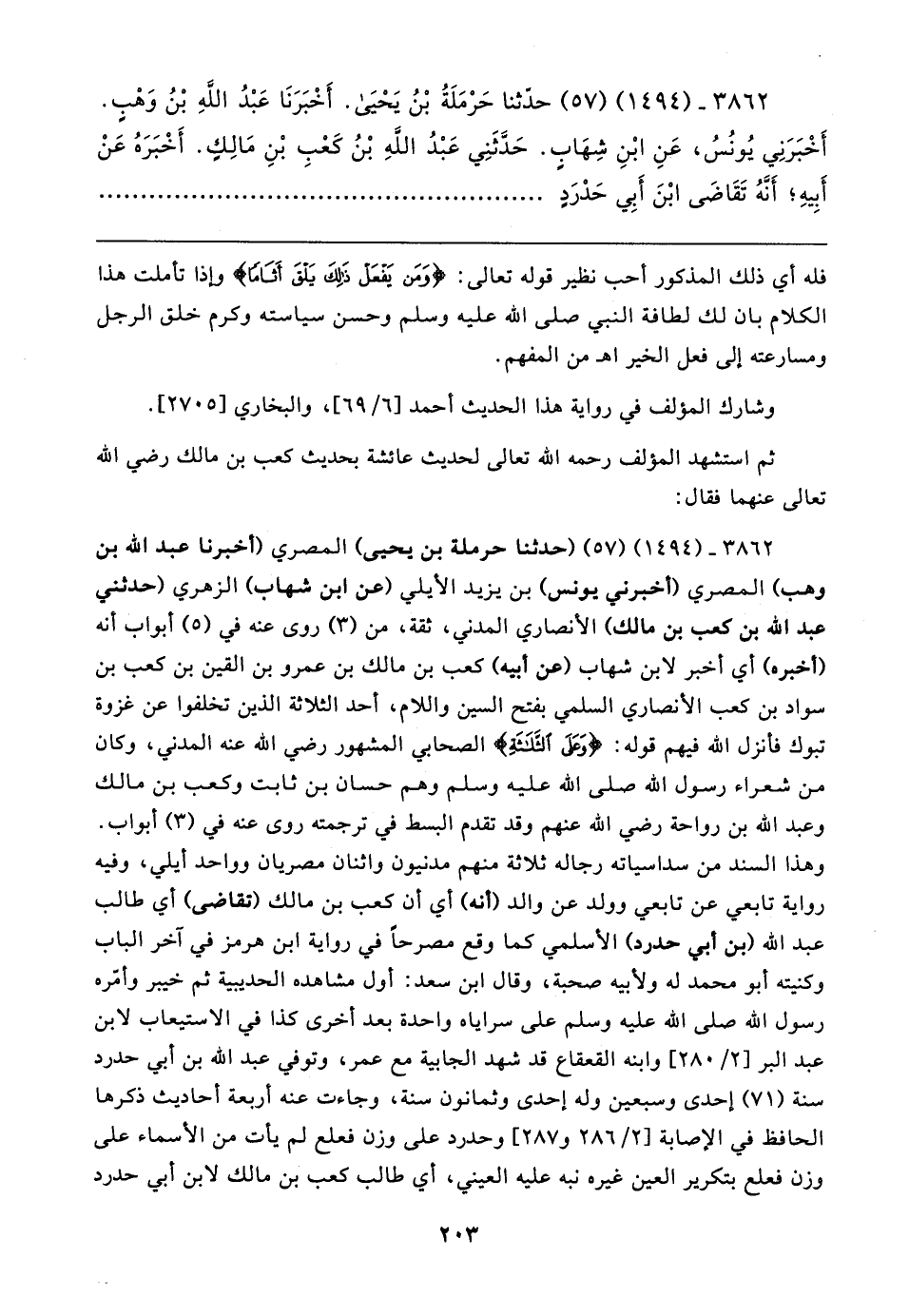 ٣٨٦٢ - (١٤٩٤) (٥٧) حَدَّثَنَا حَرْمَلَةُ بْنُ يَحْيَى. أَخْبَرَنَا عَبْدُ اللَّهِ بْنُ وَهْبٍ. أَخْبَرَنِي يُونُسُ، عَنِ ابْنِ شِهَابٍ. حَدَّثَنِي عَبْدُ اللَّهِ بْنُ كَعْبِ بْنِ مَالِكٍ. أَخْبَرَهُ عَنْ أَبِيهِ؛ أَنَّهُ تَقَاضَى ابْنَ أَبِي حَدْرَدٍ