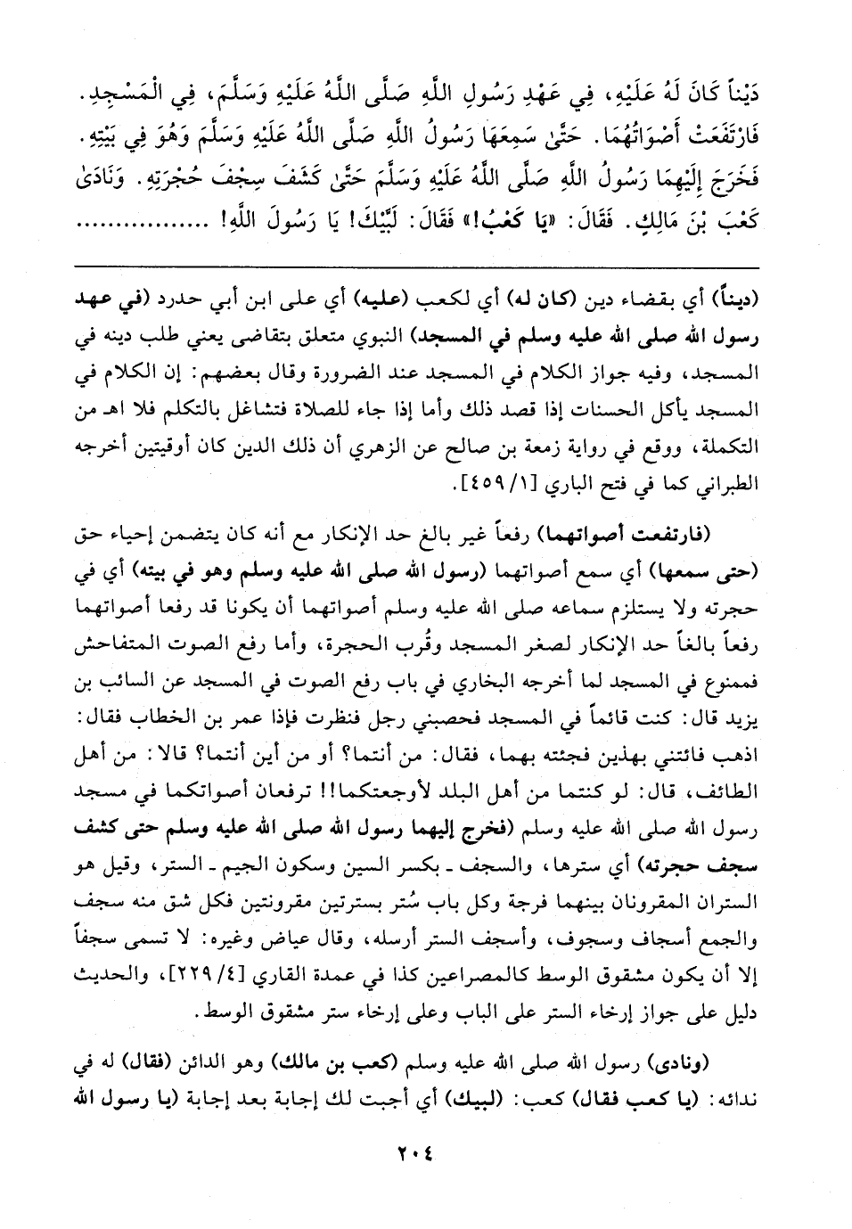 دَيْنًا كَانَ لَهُ عَلَيهِ, فِي عَهْدِ رَسُولِ اللَّهِ صلى الله عليه وسلم, فِي الْمَسْجِدِ. فَارْتَفَعَتْ أَصْوَاتُهُمَا. حَتَّى سَمِعَهَا رَسُولُ اللهِ صلى الله عليه وسلم وَهُوَ فِي بَيتِهِ. فَخَرَجَ إِلَيهِمَا رَسُولُ اللهِ صلى الله عليه وسلم حَتَّى كَشَفَ سِجْفَ حُجْرَتِهِ. وَنَادَى كَعْبَ بْنَ مَالِكٍ. فَقَال: "يَا كَعْبُ! ". فَقَال: لَبَّيكَ يَا رَسُولَ اللهِ!