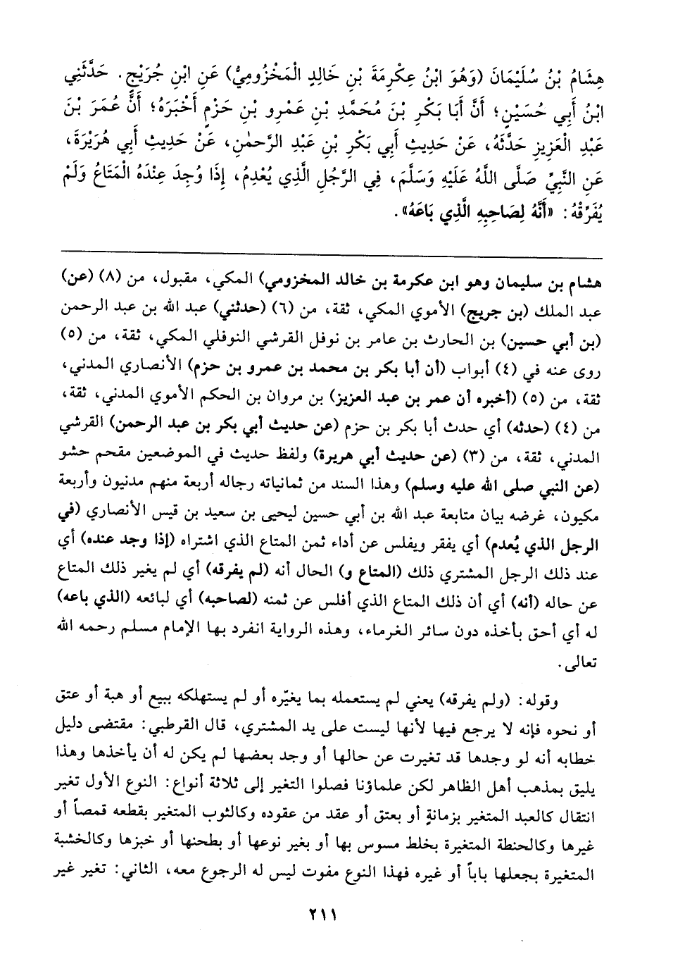 هشام بن سليمان وهو ابن عكرمة بن خالد المخزومي) المكي، مقبول، من (٨) (عن) عبد الملك (بن جريج) الأموي المكي، ثقة، من (٦) (حدثني) عبد الله بن عبد الرحمن (بن أبي حسين) بن الحارث بن عامر بن نوفل القرشي النوفلي المكي، ثقة، من (٥) روى عنه في (٤) أبواب (أن أبا بكر بن محمد بن عمرو بن حزم) الأنصاري المدني، ثقة، من (٥) (أخبره أن عمر بن عبد العزيز) بن مروان بن الحكم الأموي المدني، ثقة، من (٤) (حدثه) أي حدث أبا بكر بن حزم (عن حديث أبي بكر بن عبد الرحمن) القرشي المدني، ثقة، من (٣) (عن حديث أبي هريرة) ولفظ حديث في الموضعين مقحم حشو (عن النبي صلى الله عليه وسلم) وهذا السند من ثمانياته رجاله أربعة منهم مدنيون وأربعة مكيون، غرضه بيان متابعة عبد الله بن أبي حسين ليحيى بن سعيد بن قيس الأنصاري (في الرجل الذي يُعدم) أي يفقر ويفلس عن أداء ثمن المتاع الذي اشتراه (إذا وجد عنده) أي عند ذلك الرجل المشتري ذلك (المتاع و) الحال أنه (لم يفرقه) أي لم يغير ذلك المتاع عن حاله (أنه) أي أن ذلك المتاع الذي أفلس عن ثمنه (لصاحبه) أي لبائعه (الذي باعه) له أي أحق بأخذه دون سائر الغرماء، وهذه الرواية انفرد بها الإمام مسلم رحمه الله تعالى.
